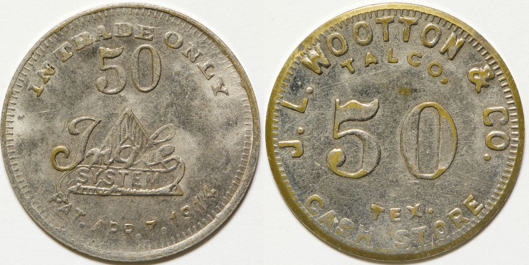 Cash Store token for 50 IT. Talco was derived from Texas Arkansas Louisiana Country in 1856 HWAC# 62706 Date: Location: Talco, Texas