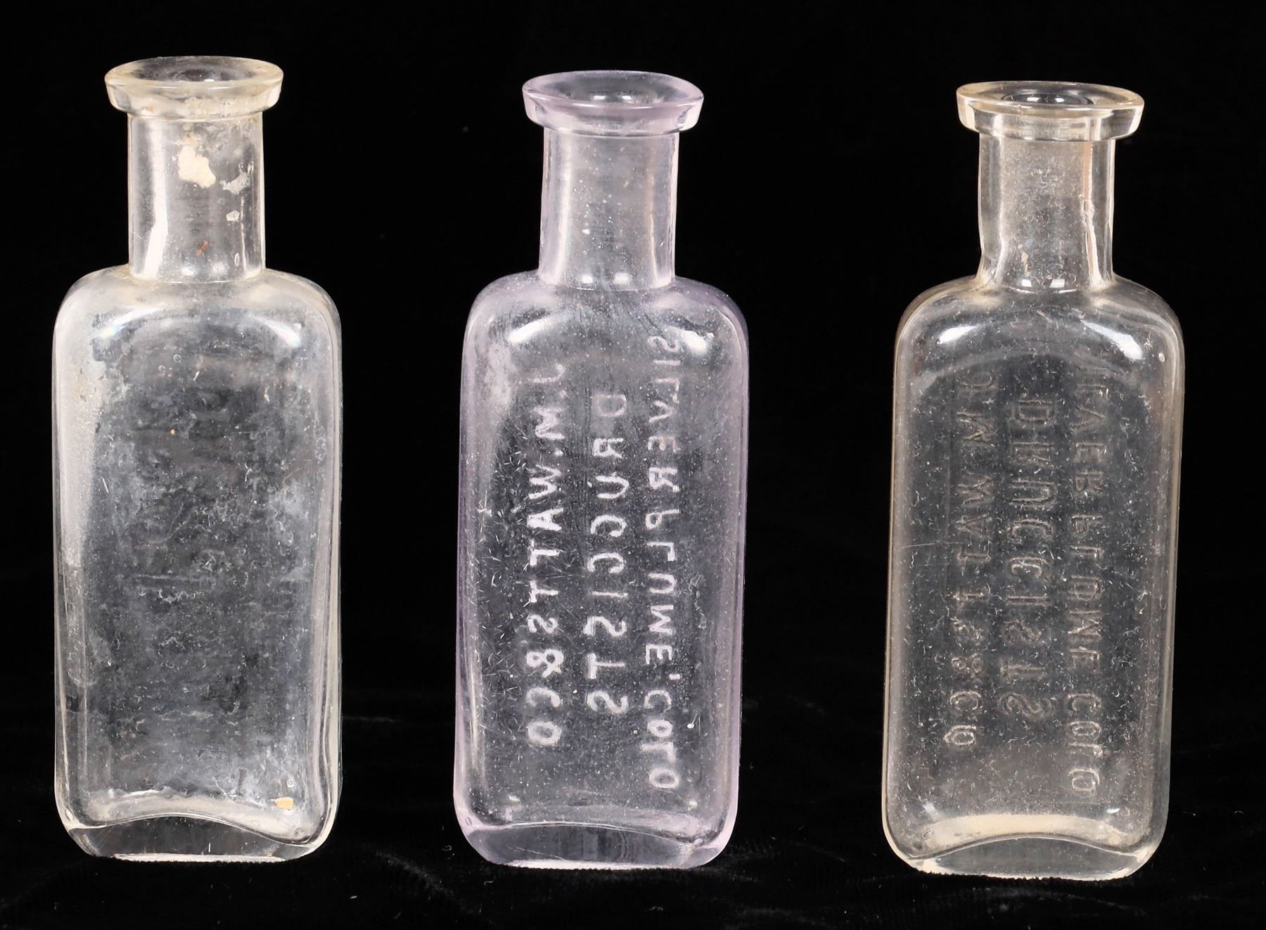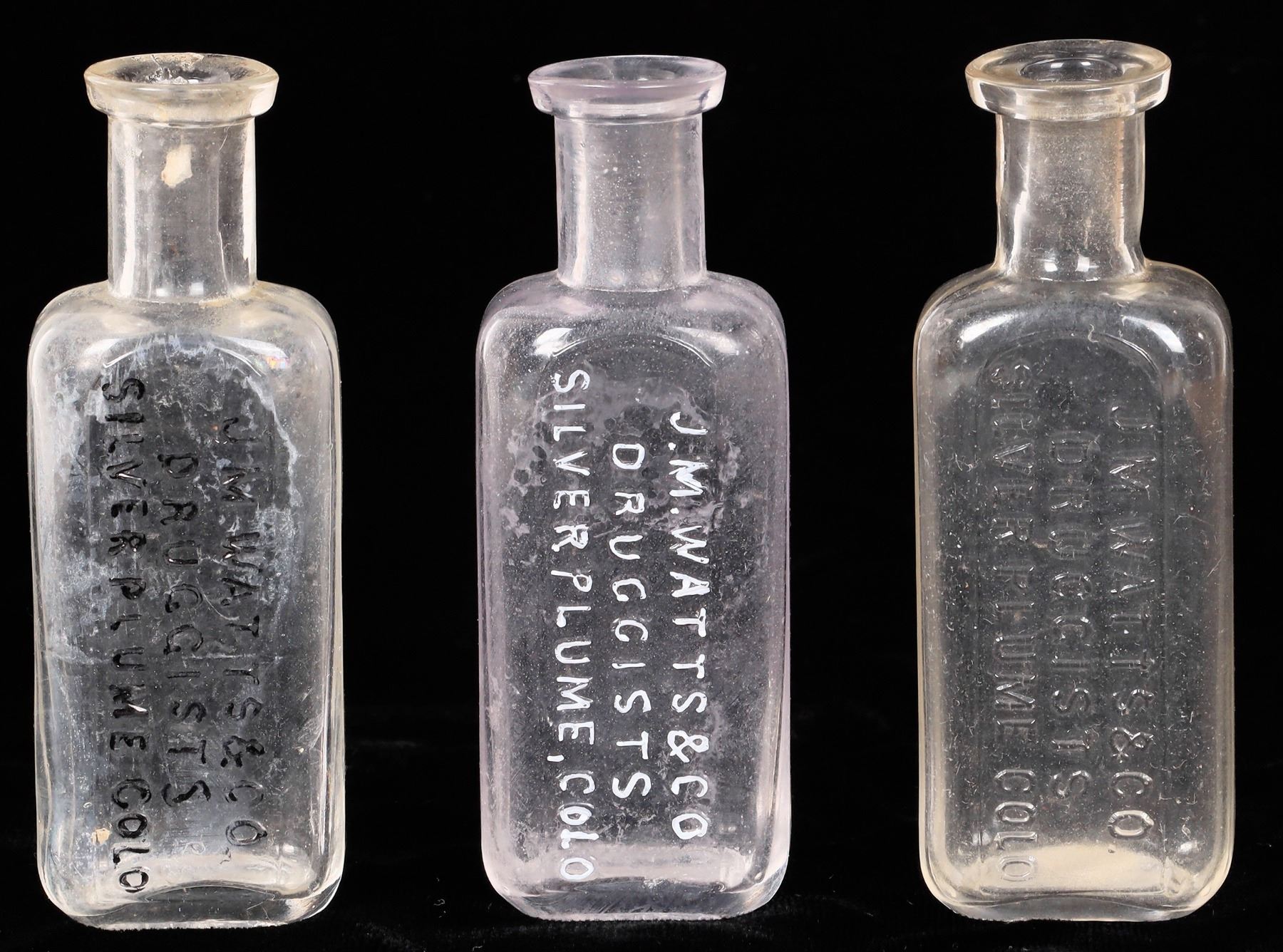 R3 in Preble, c. 1887-90. 3 embossed, white and black embossed. The only embossed medicine from Silver Plume. J. M. Watts & Co./Druggists/Silver Plume Colo. All 3.5". No apparent chips or cracks.