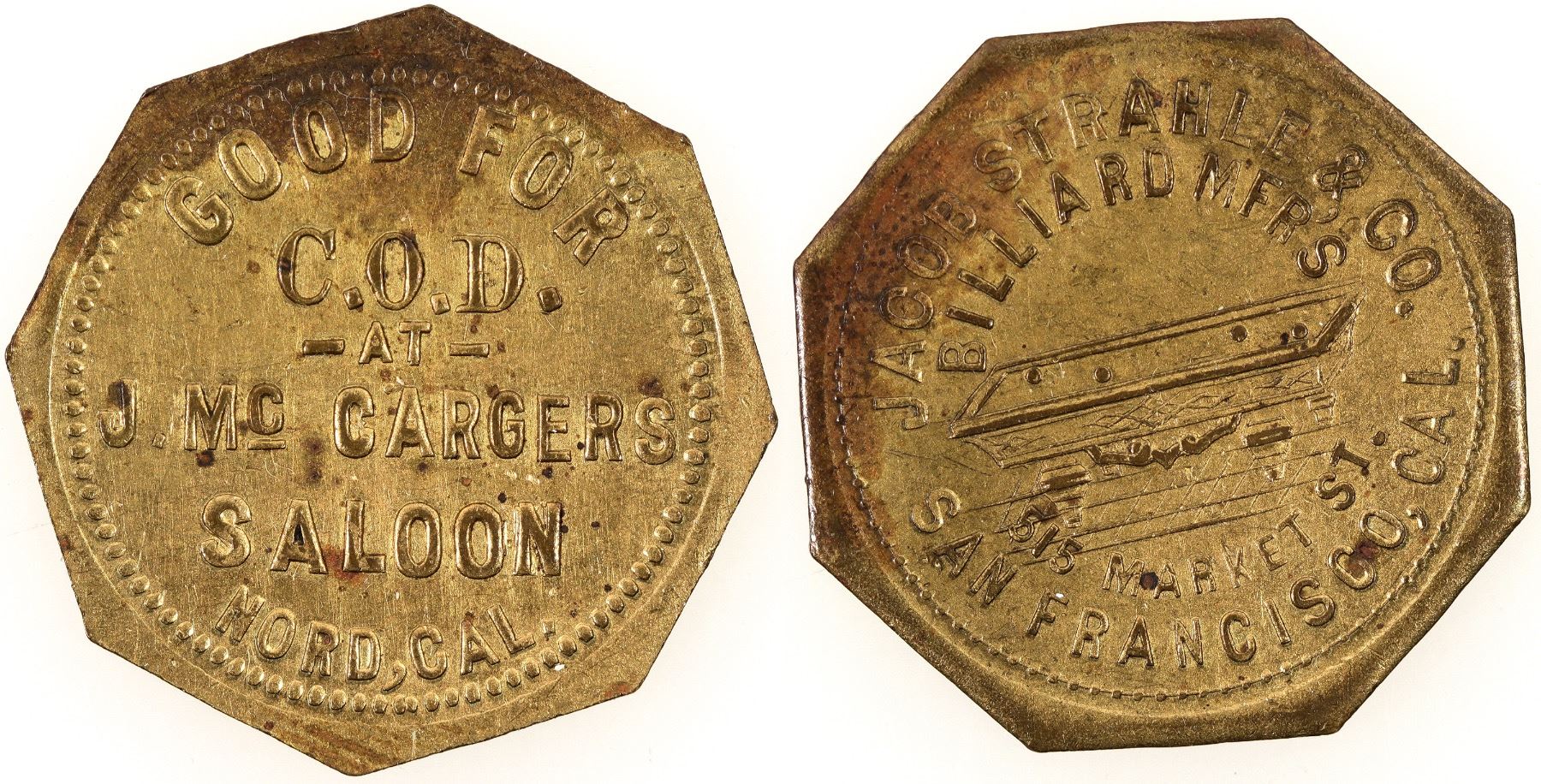 Brass octagonal 1" GF/C O D/J McCargers Saloon/Nord, Cal.//Jacob Strakle & Co/Billiards/515 Market St./San Francisco, Cal. Nord California