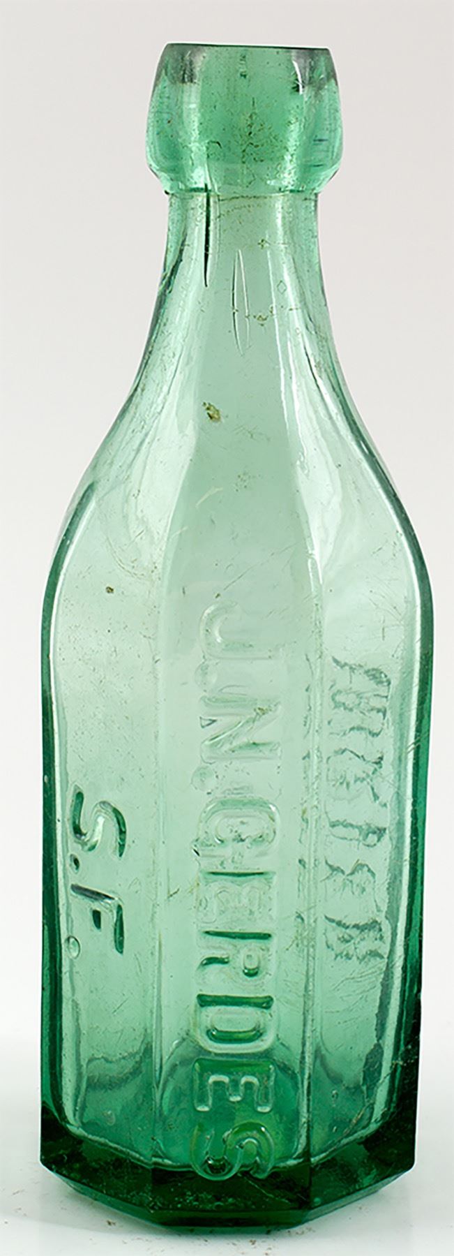 J. N.Gerdes / S. F. // Mineral water. ( 8 sided, paneled soda ). Pale green color, blob top soda bottle. Smooth base. Clean and shiny, with light wear. Two small base flakes, and a mold imperfection in the side. Some light body scratching. Rare in this colorization...(RH) State: California City: San Francisco Date: 1873-1877 HWAC# 30118