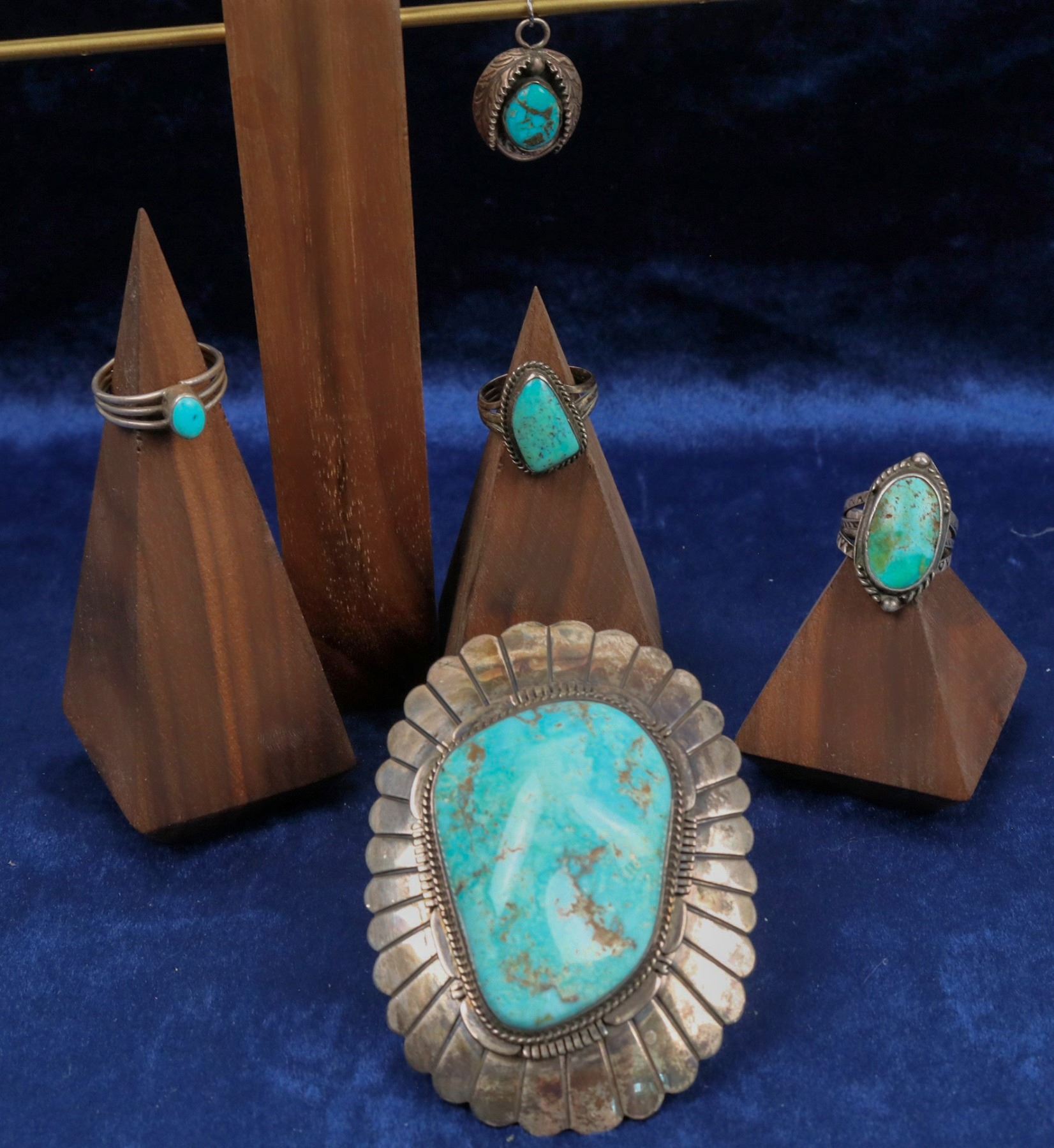 also included in this lot are 3 rings, each set with turquoise stones and a small pendant, with turquoise stone set shadow box style.