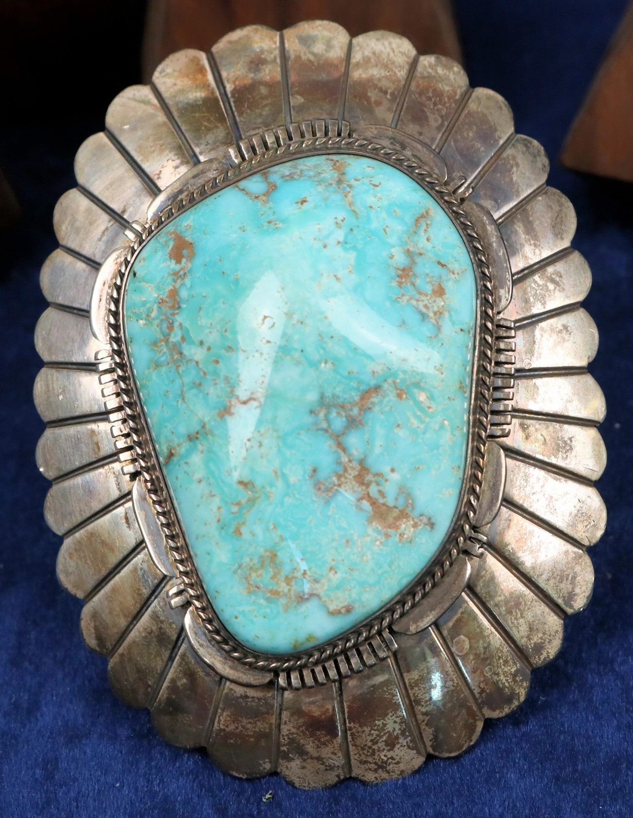 Handcrafted by Navajo silversmith J. Nelson, this belt buckle is signed. Gorgeous turquoise stone (possibly Royston) set with twisted wire surround and engraved modern feather design. 3" x 2.25".