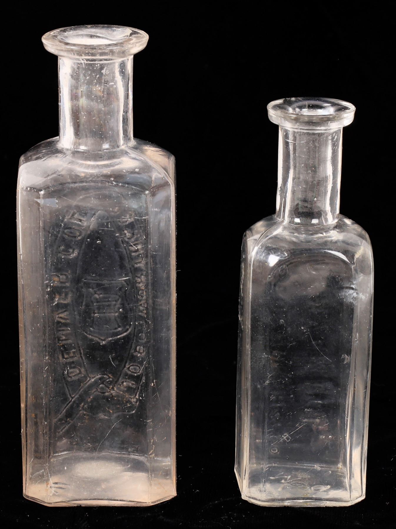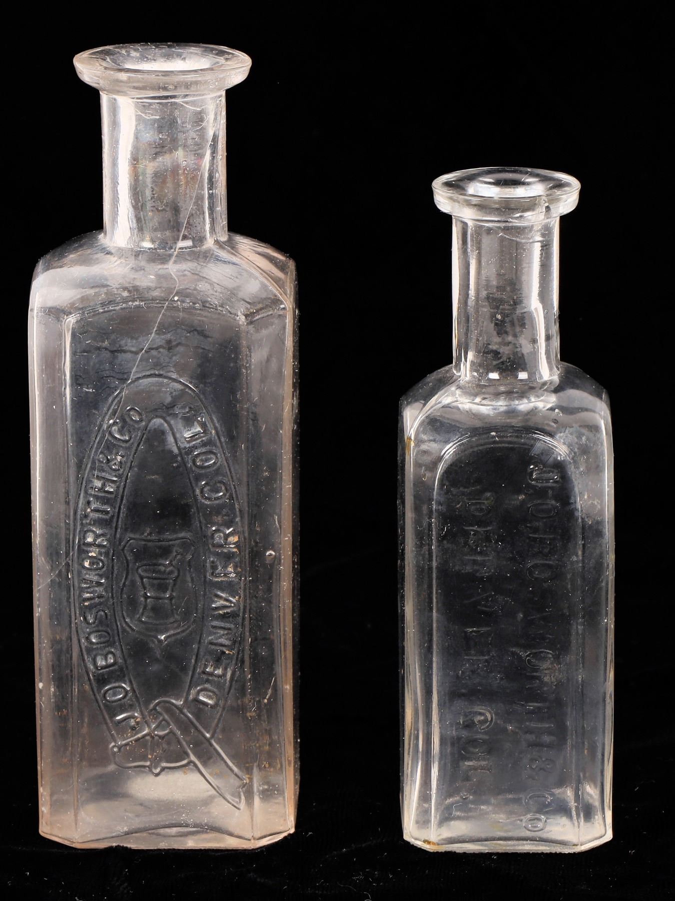 Both are unlisted varieties in Preble. c. 1873-77. J. O. Bosworth/Denver. Col. 5", with W McC on base, not Stoeckel. Side molding flaw. 4.5" variety has no monogram, flattened letters which indicates an earlier bottle with no air vents in letters. Flattened applied top, possibly the first of the Bosworths. .25" lip chip.