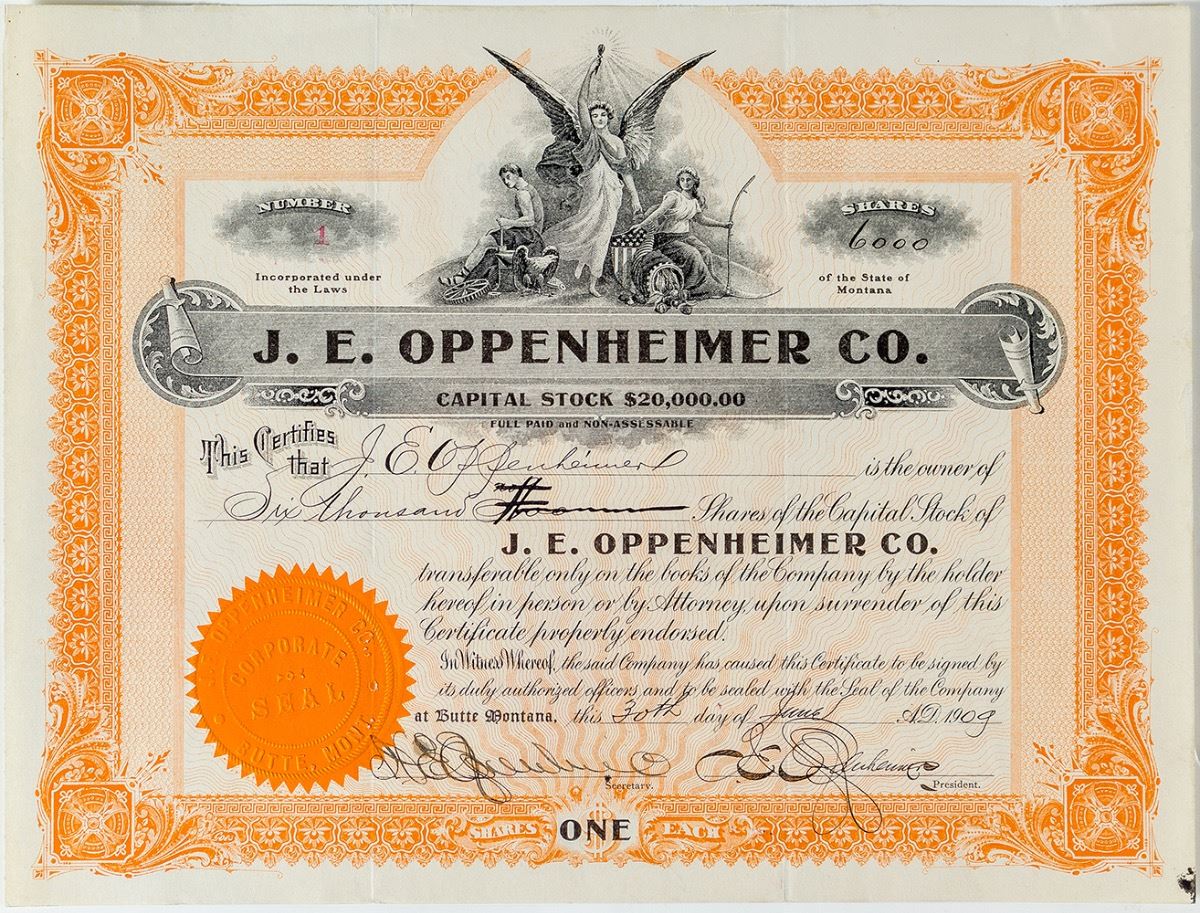 Discovery piece! J. E. Oppenheimer Co., no 1, 6000 shares, issued to founder and president, J. E. Oppenheimer, 1909. City: Butte State: Montana Date: 1909 ID: 36264