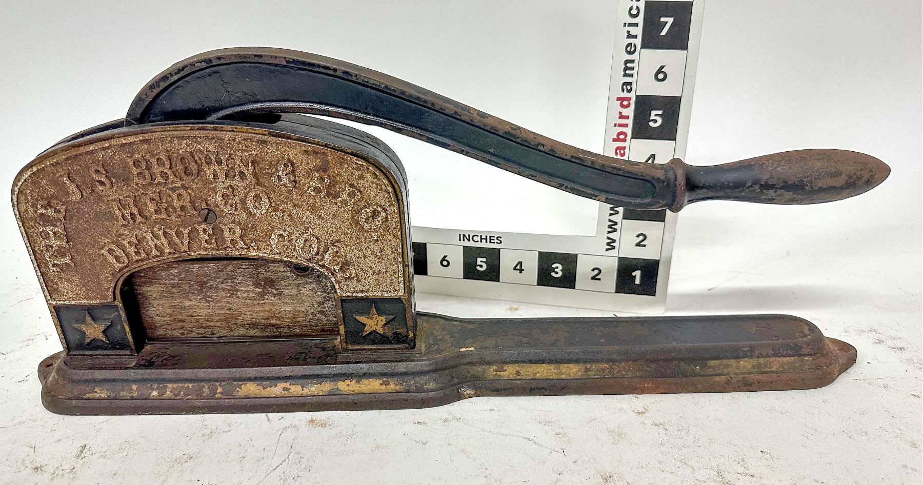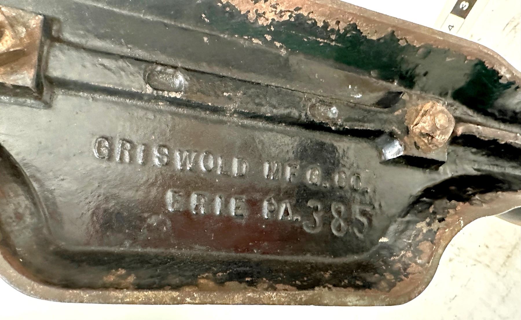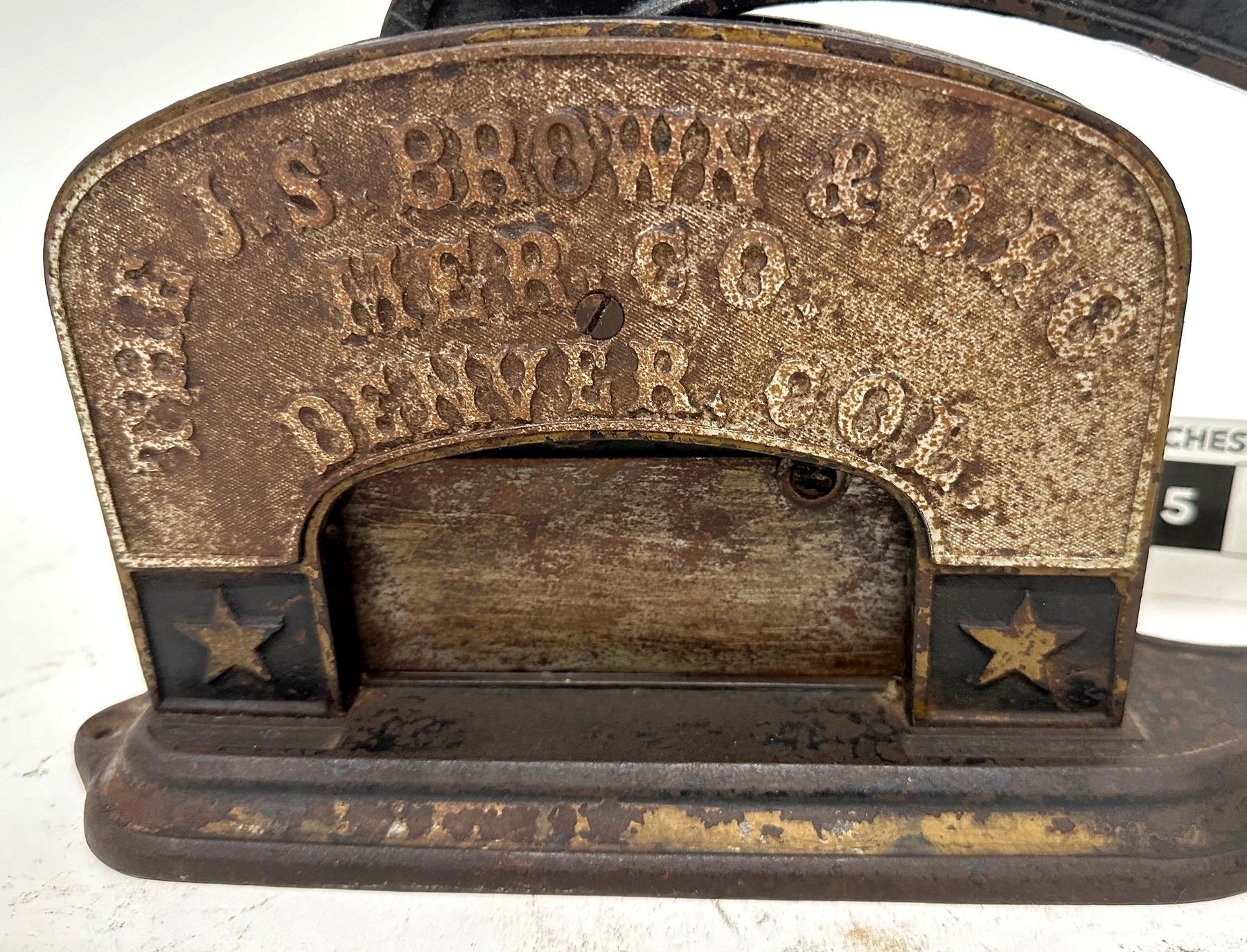 The J. S. Brown & Bro. / Mer. Co. / Denver, Col. 19" long. Painted wording along base is illegible. Underside: Griswold MFG Co. Erie PA Colorado Gary Bracken Collection