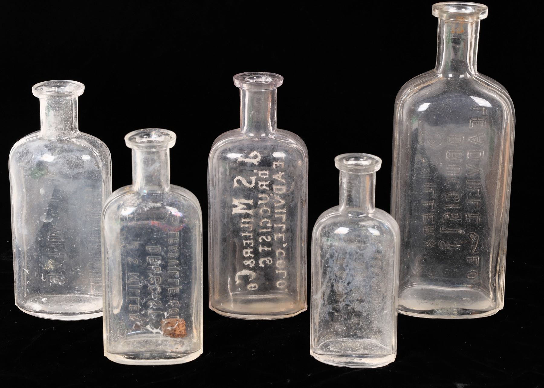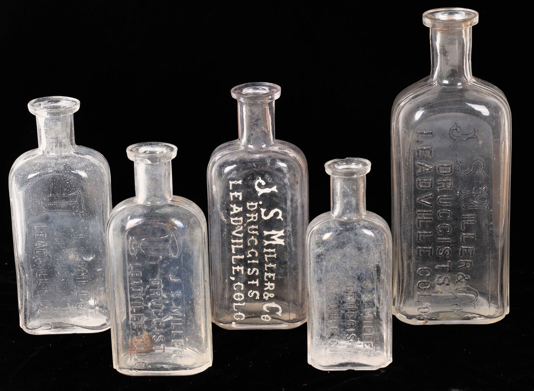 5 R3 in Preble bottles in 2 patterns. J S Miller & Co./Druggists/Leadville, Colo. 4"-small lip chip, 4.5", 5" , white 5", 6.5". No other apparent chips or cracks.