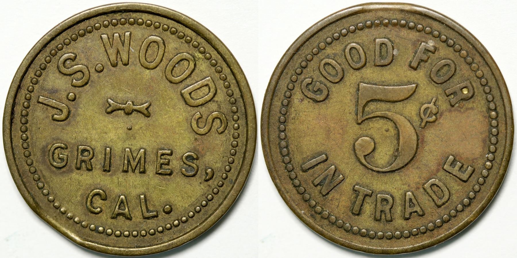 Obv.: J. S. Woods / Grimes, / Cal.; Rev.: Good For / 5c / In Trade. Br. rd, 21 mm. Formerly called Grimes Landing, this Colusa County town is located on the Sacramento River.