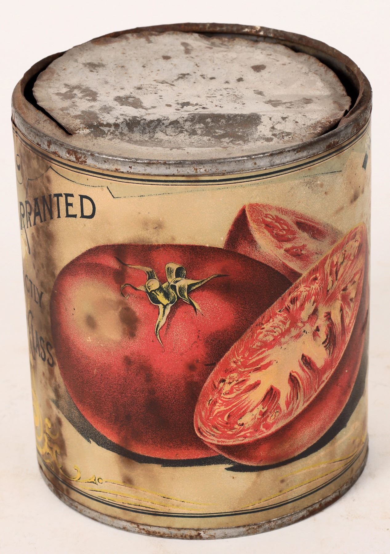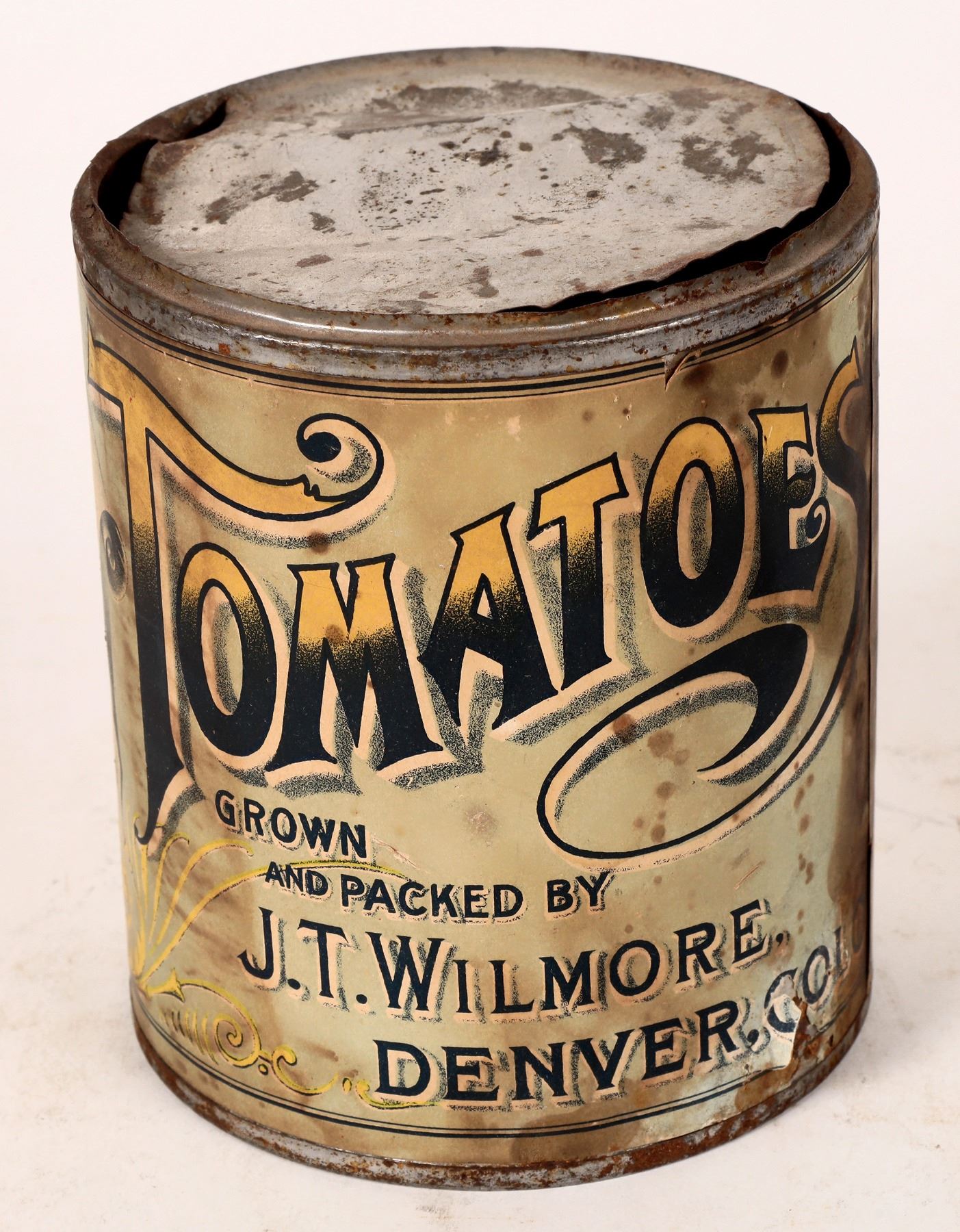 J T Wilmore, Denver, Colo tomatoes tin, 4.75" tall. label has stain, small chip. Colorado Denver Gary Bracken Collection