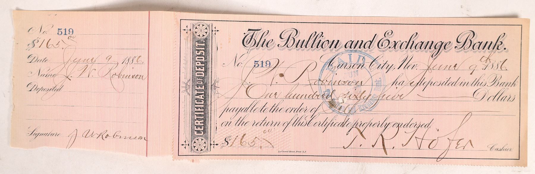 1886 Carson City deposit slip for $165. Is this the same J W Robinson that started the department store? The timeline is correct. "J. W. Robinson Co., Robinson's, was a chain of department stores operating in the Southern California and Arizona area, previously with headquarters in Los Angeles, California. Joseph Winchester Robinson was a merchant from Waltham, Massachusetts who moved to Rosemead, California in 1882 to develop orange groves. Robinson found the quality of goods and service from local merchants lacking, and reentered the retail business, utilizing his contacts on the East Coast to deliver superior merchandise. Robinson opened the 1,440 sq ft (134 m2) Boston Dry Goods Store in 1883 at the Allen Block at the southwest corner of Spring and Temple streets, stating that his store offered "fine stocks and refined 'Boston' service." In 1891, J. W. Robinson died at the age of 45 and his father, Henry Winchester Robinson, came from Boston to Los Angeles to take over the business, and the "Boston Dry Goods Store" was renamed the "J. W. Robinson Company" in honor of its late founder." from wikipedia Carson City Nevada