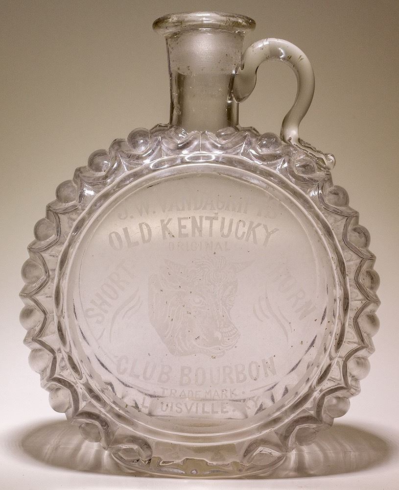 Clear back bar handled whiskey jug. "JW Vandagrift's Old Kentucky Original Short Horn Club Bourbon." Trademark, Louisville, Kentucky.age of steer's head at center. Professional engraving of obverse, reverse blank, bottom blank. This bottle is a match in construction form to the Casper jug. Thought to be extremely rare. Originally had a custom fit top. John W. Vandagrift (1827-1909) was a successful carpenter turned miner, turned whiskey distiller. Born in Pennsylvania, he and his family, including his brother James, went to California to prospect for gold in 1869. Even though they were in California after the gold rush and the Comstock Rush, they were successful. Unfortunately, they were attacked by Mexican bandits and James was killed. John and family thus chose to return to Pennsylvania, and started what was so popular in the West, a liquor business, in 1875. They built a plant on the Monongahela River at Fredericktown, which they continued to operate until 1920. Jack Sullivan wrote an article entitled: "John Vandegrift: The Carpenter who Crafted Whiskey" in 2014, available on the web. http://pre-prowhiskeymen.blogspot.com/2014/03/john-vandegrift-carpenter-who-crafted.html. Note: Bottle shows name as "Vandagrift", book title uses "Vandegrift" as spelling. City: Louisville State: Kentucky Inventory Number: 38948