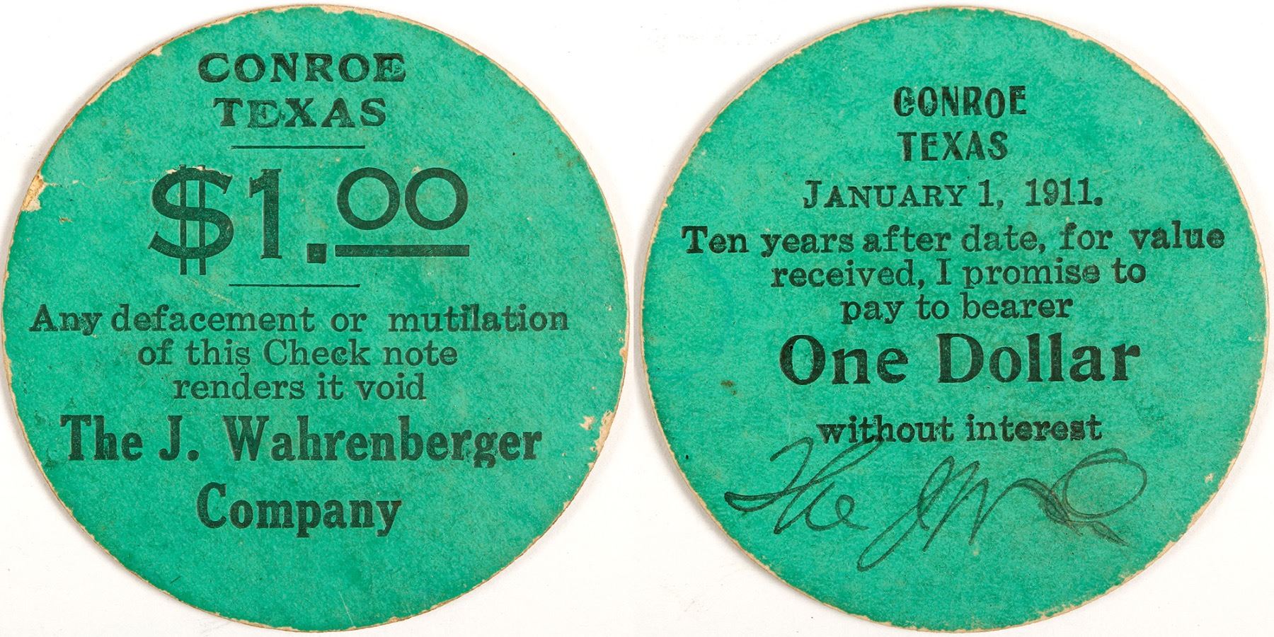 Round paper 39mm CONROE TEXAS / $1.00 / Any defacement or mutilation of this Check note renders it void / The J. Wahrenberger Company // CONROE TEXAS / January 11, 1911. / Ten years after date, for value received, I promise to pay to bearer / one dollar without interest / (pen signature). Unlisted denomination. HWAC# 62311 Date: Location: Conroe, Texas