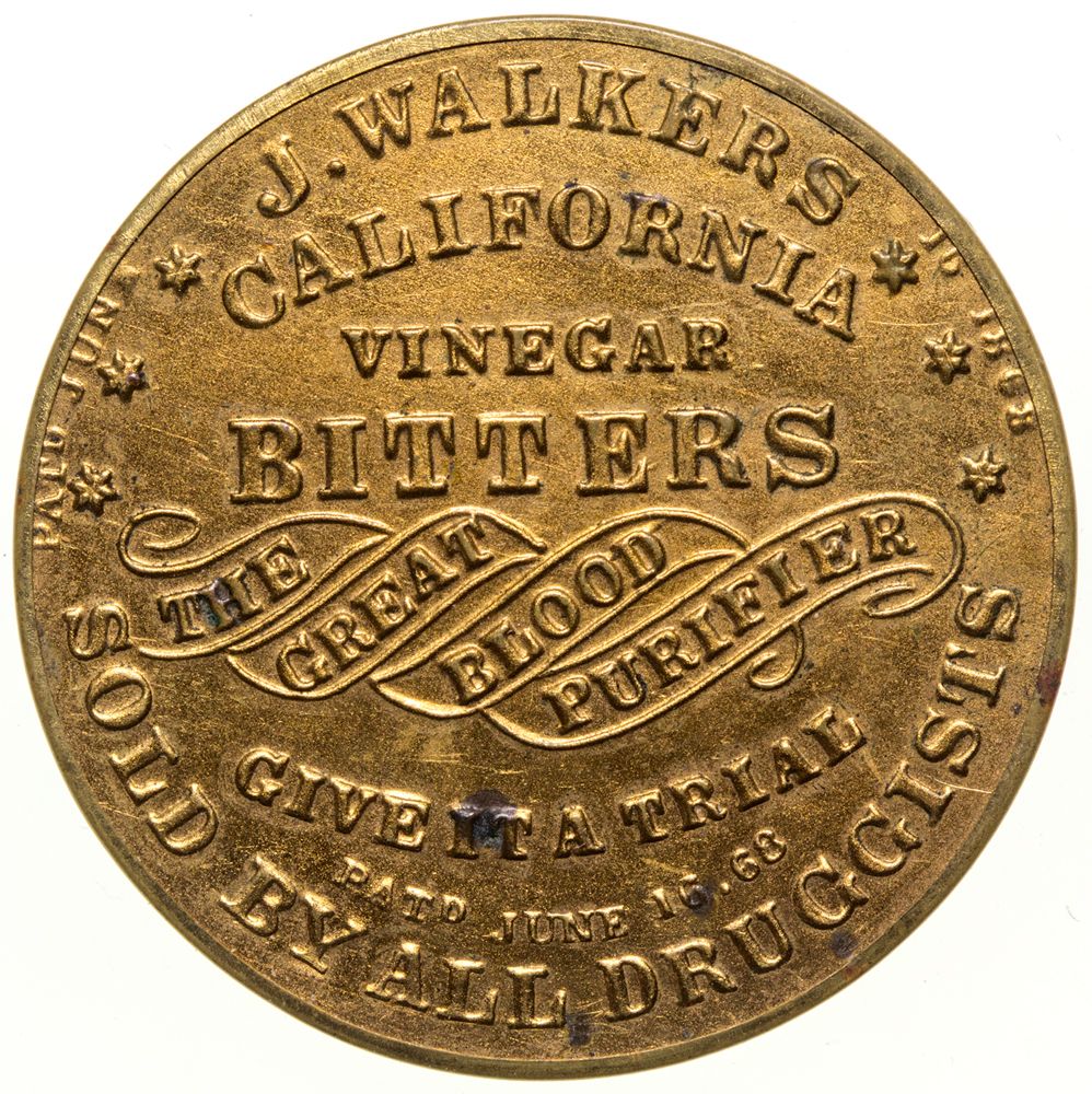 c. 1880. "J. Walker's California Vinegar Bitters. The Great Blood Purifier. Give it a Trial. Pat'd June 16, 68. Sold by all druggists." Reverse is mirror. Burt Collection