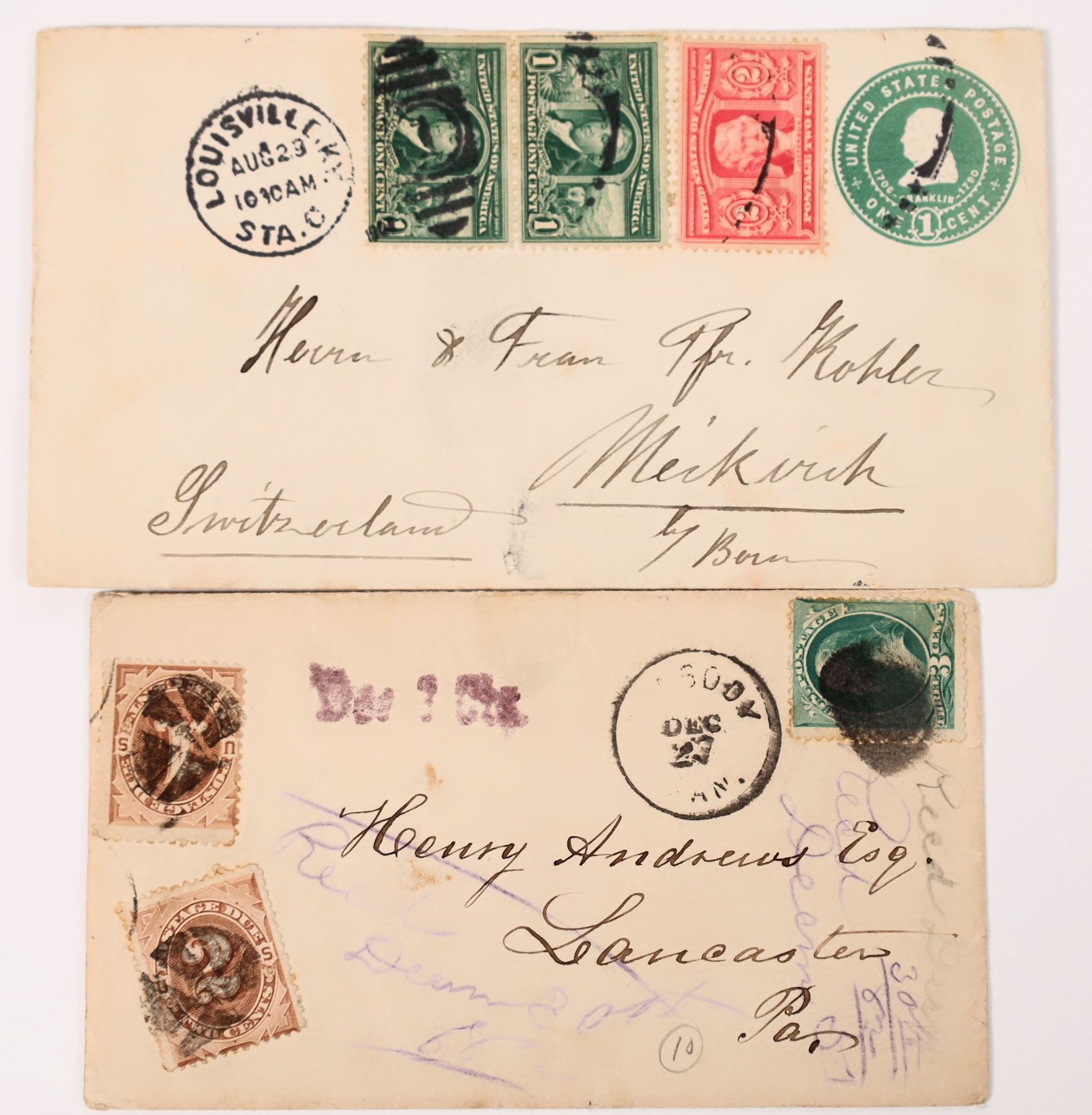 J1 and J2 registered mail on 1882 cover, also 2x 2 cent postage due stamps. Additional cover with 2x green 1 cent, red 2 cent and 1 cent postal stationary.
