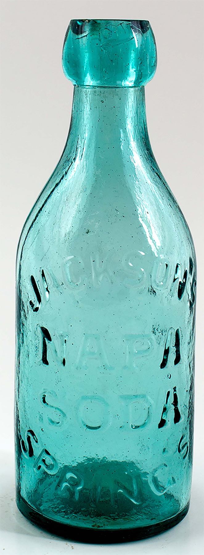 Jackson's ( au ) / Napa / Soda / Springs ( ad )// Reverse : Natural / Mineral Water // Aqua, blob top , mineral water bottle. 7 1/4 ", applied top. Clean and shiny, like a brand new bottle. Crude, specimen with nice whittle to the body area. There is a 3/8" bruise in the inside lip of the bottle. Almost impossible to see, but you can barley see, the rainbow reflection. Very minute defect, considering the overall appearance of this outstanding specimen.Also, minute pinhead on the base. Other wise , very nice. ( RH). State: California City: San Francisco Date: 1873-1885 HWAC# 30203