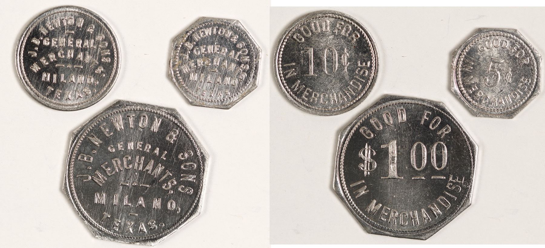 1) Octagonal aluminum 21mm J. B. NEWTON & SONS / GENERAL MERCHANTS /MILANO TEXAS // GF / 5C IM 2) Round aluminum 24mm J. B. NEWTON & SONS / GENERAL MERCHANTS /MILANO TEXAS // GF / 10C IM 3) Octagonal aluminum 35mm J. B. NEWTON & SONS / GENERAL MERCHANTS /MILANO TEXAS // GF / $1.oo IM. 3 of the 5 different denominations in this 2 merchant town. HWAC# 62353 Date: Location: Milano, Texas