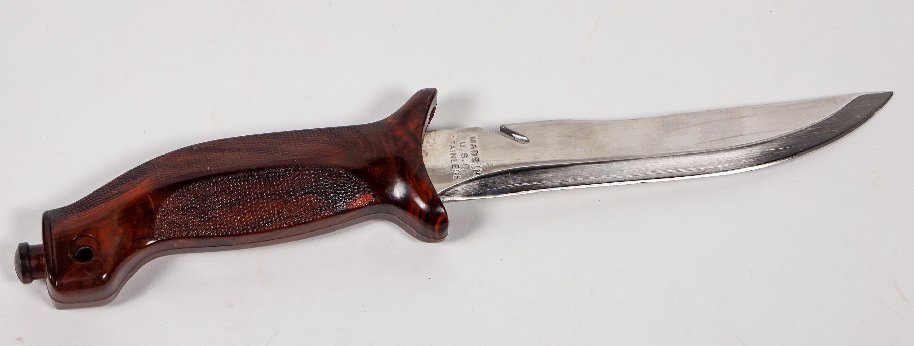 This tactical hunting knife is 10.25 in. overall length with a 5.5 in. straight blade and molded-in plastic grip. The JDL marked hard rubber sheath is marked "JDL/ Orange/ Ca.". The knife and sheath are custom made together fashioned that the pommel button secures the knife into the sheath at the top. Like new condition. "Made in USA. stainless" on the ricasso. Please see photos for details.