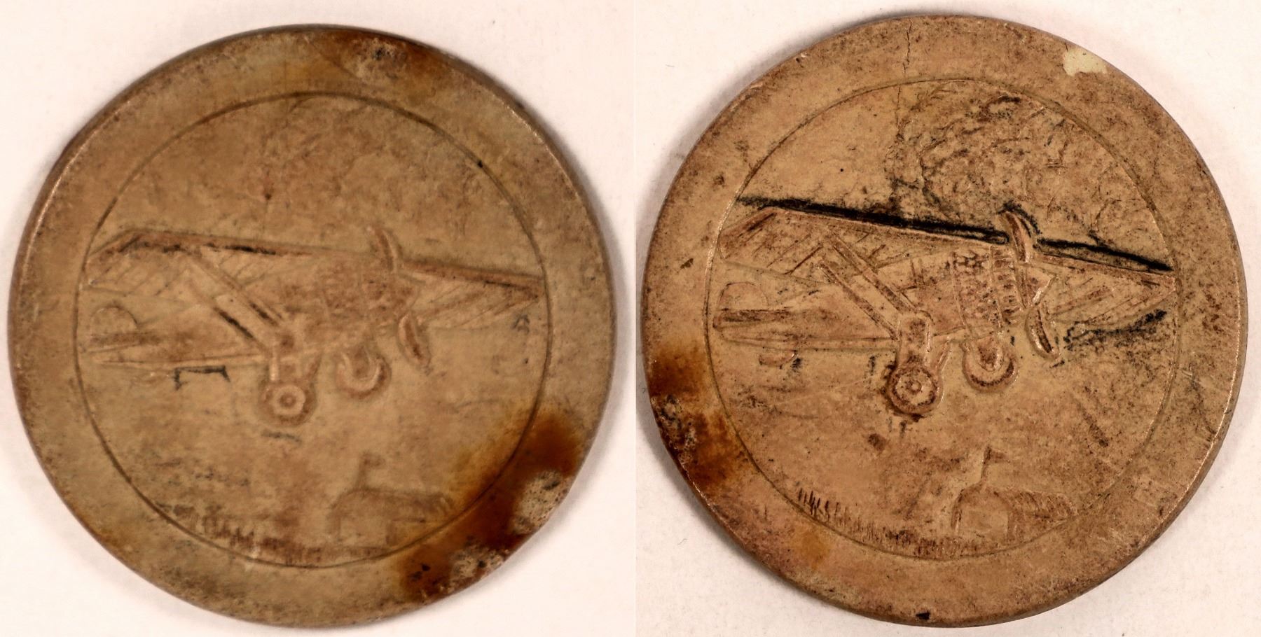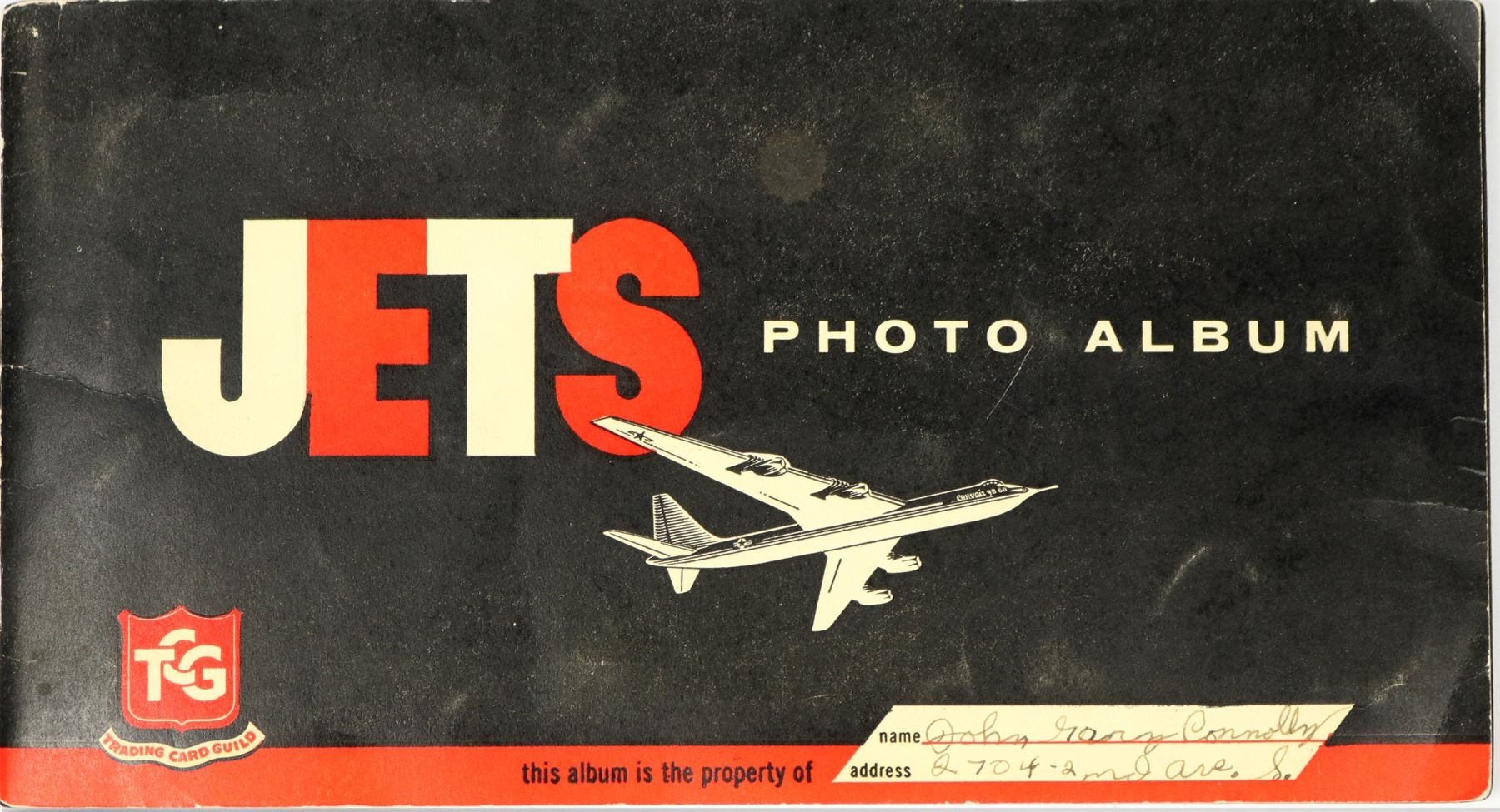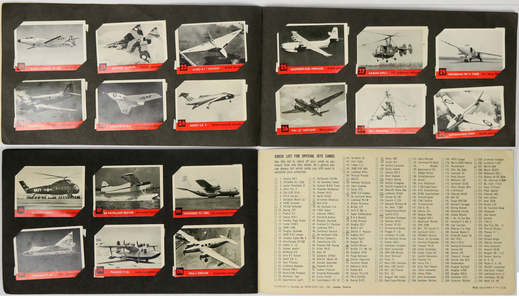 Photo album of nearly 120 aircraft of the 1950s, made by the Trading Card Guild. There are 240 cards available, but this album has a few less than the 120 it will hold. Each photo card is 3 x 2 inches in black and white. Jet fighters, helicopters, transport planes, trainers from all over the world are pictured. 15 missing, so there's 105 cards included. Plus an aviation poker chip. The Trading Card Guild was an attempt by Topps Chewing Gum to widen the market for collectable cards beyond sports and into more upscale stores.