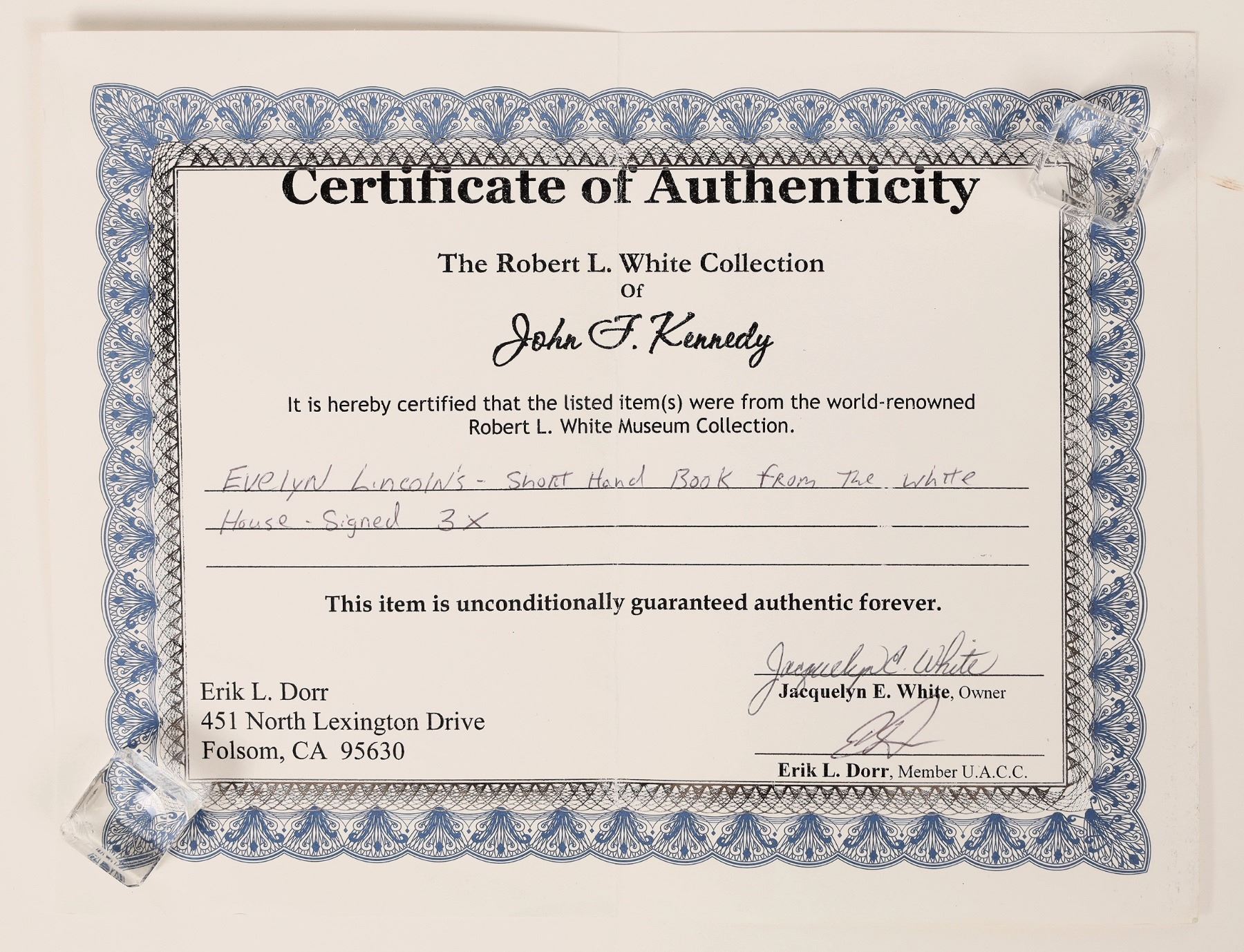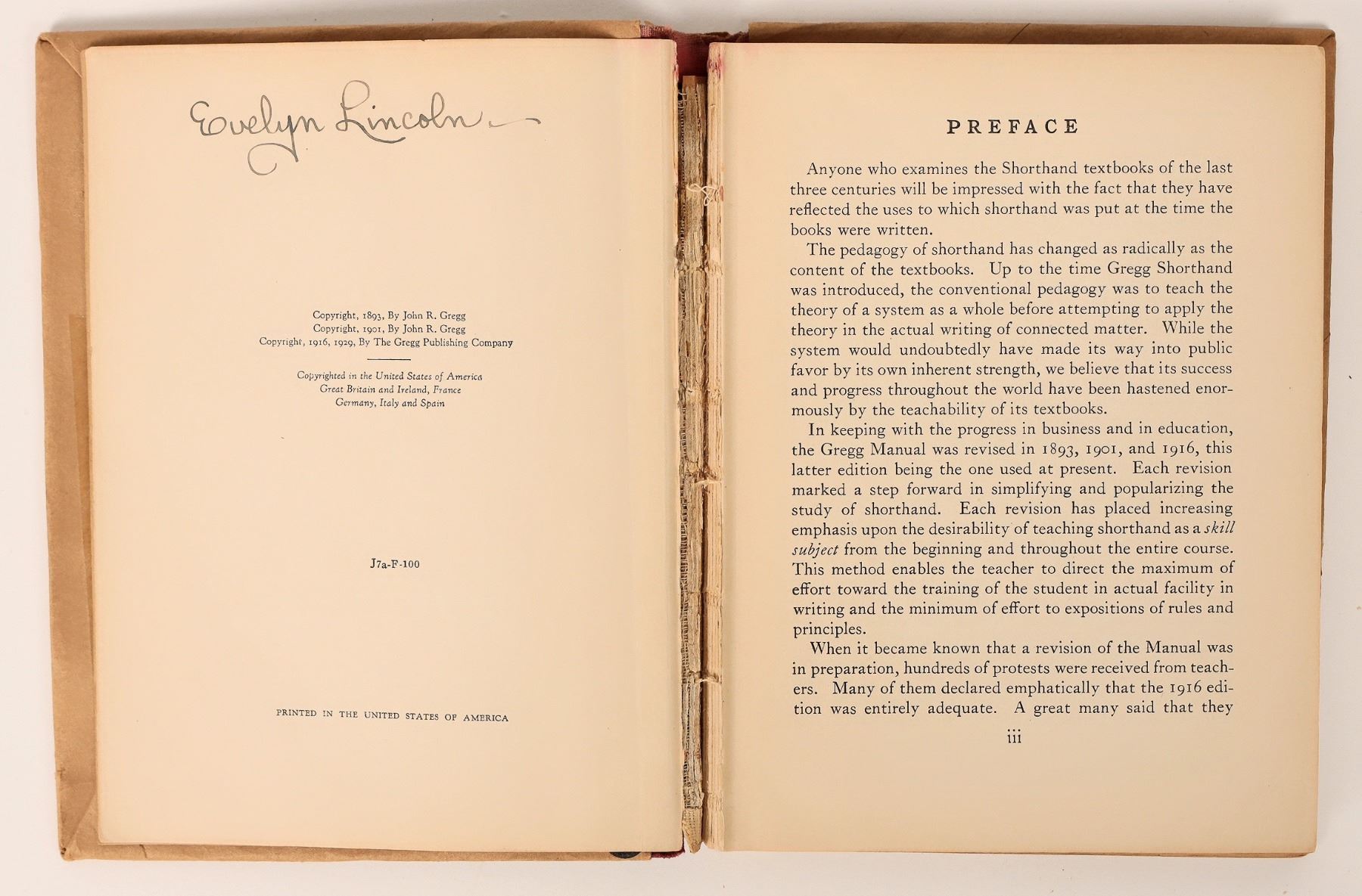 President John F. Kennedy 's secretary was Evelyn Lincoln. This is her shorthand book she had with her for the 12 years she was his secretary. It has her signature on the cover, as well as twice inside. There is a CFA included. The book is having some spinal separation issues, but is an easy repair. Please see photos for more details.