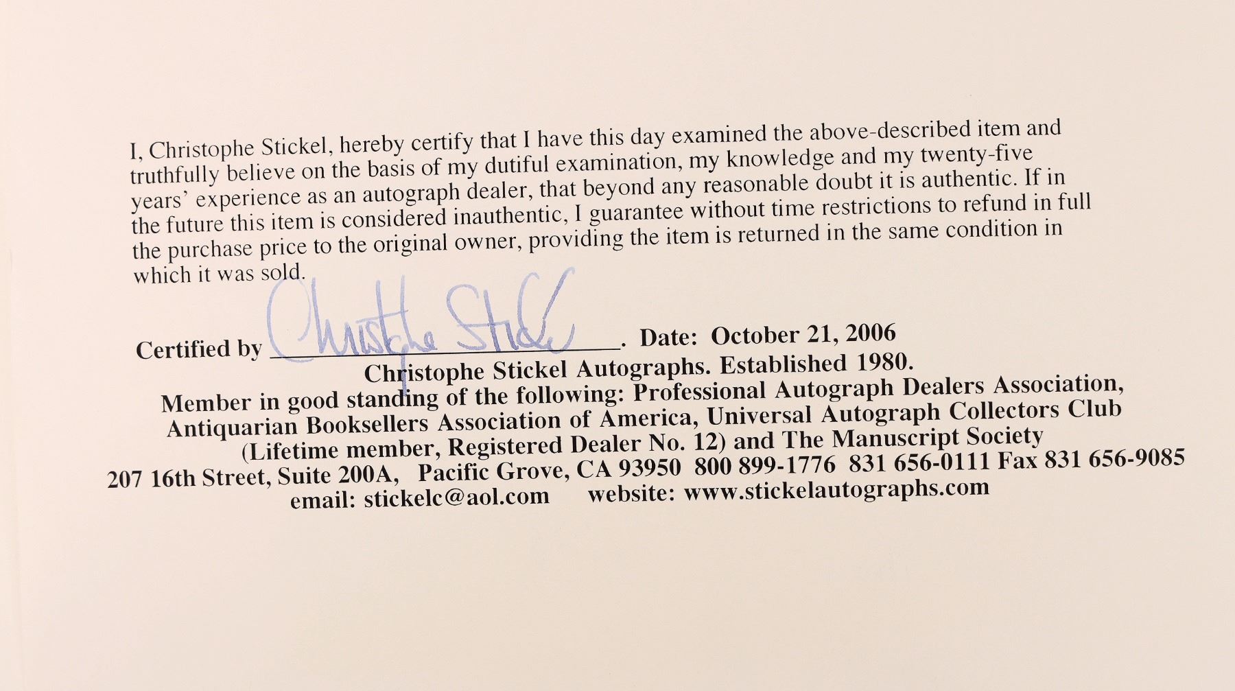 28. RETURN POLICY: All items are guaranteed to be authentic unless otherwise noted. If authenticity is challenged, please call our office for assistance. ALL SALES ARE FINAL. You may only return any piece that was significantly inaccurately described by calling our office within 10 days of receipt of item(s) and notifying us of the error and reason for return. We do not refund postage or insurance. Please call us if you require a more specific condition report. Any items that are returned must be returned in the exact, unaltered condition. When we receive your bids we will assume you have read the description in the catalog, viewed the image of the item, have contacted us regarding any questions you may have on any lot and/or have previewed the lot in person.