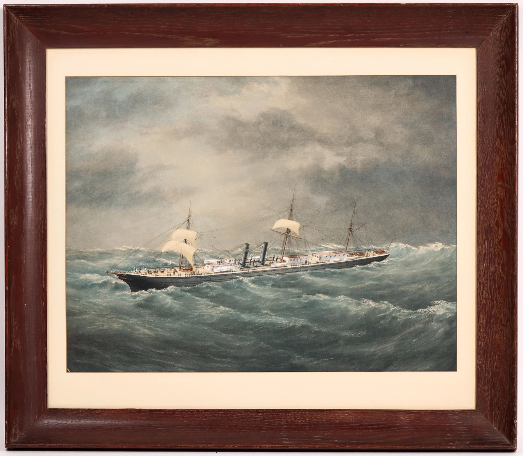 Framed 3 mast 2 funnel steamship watercolor signed by British maritime artist JG Marshall 1876 in lower right corner. We could not find any info on this artist. Painting 15x20.5", wood frame 21.75x26.75". Great Brittain