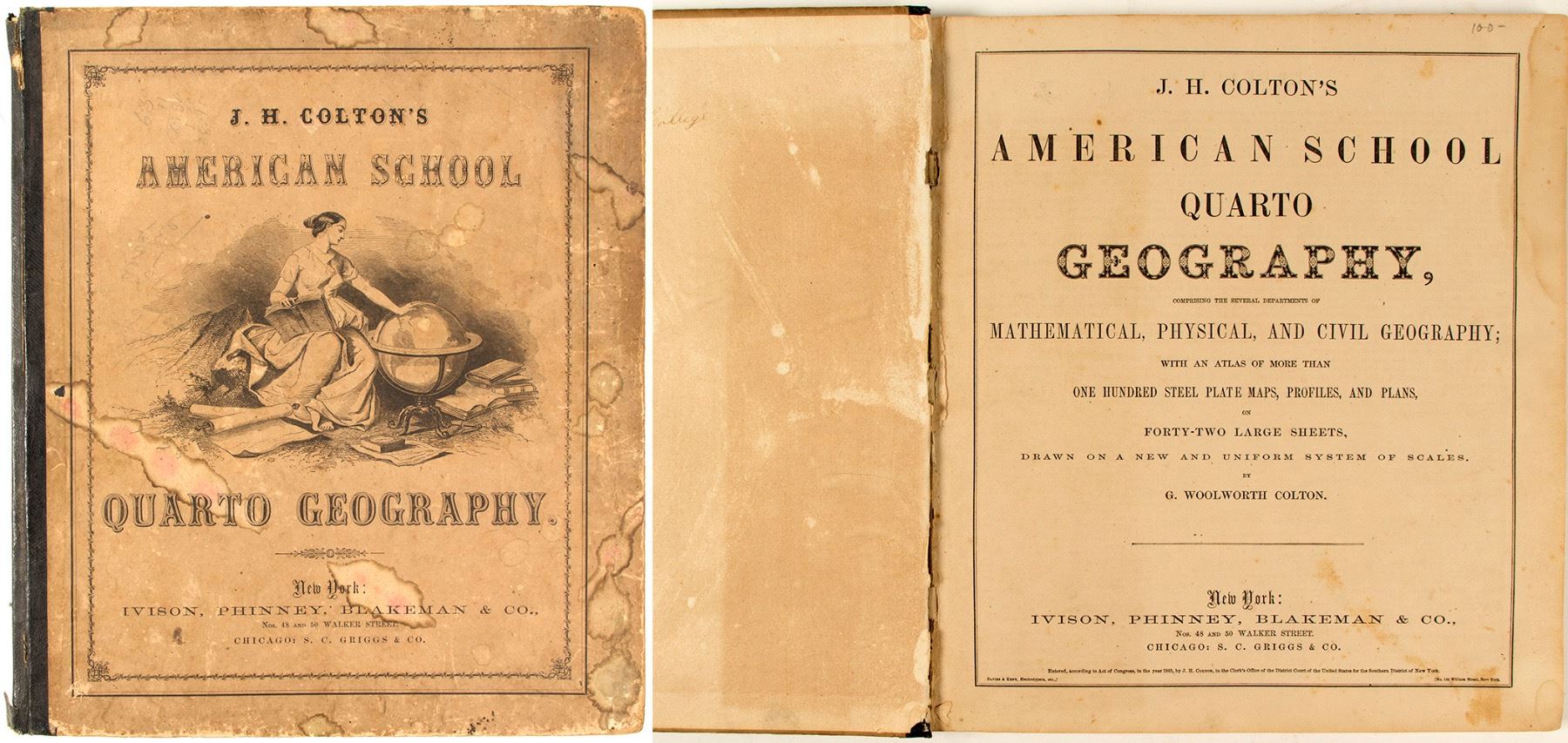 Circa 1865 Atlas by JH Coulton, called the American School Quarto Geography. Published in New York. 118 pages plus appendix. Many many maps. The book dates to approximately 1865, though the maps date to 1860, as shown printed at the base of the map. The map of the Western US is at the very beginning of the Comstock discovery. Complete. A few water stains on the cover. Finding about 85%. (Potter Collection) Date: c. 1865 Location: HWAC# 58969