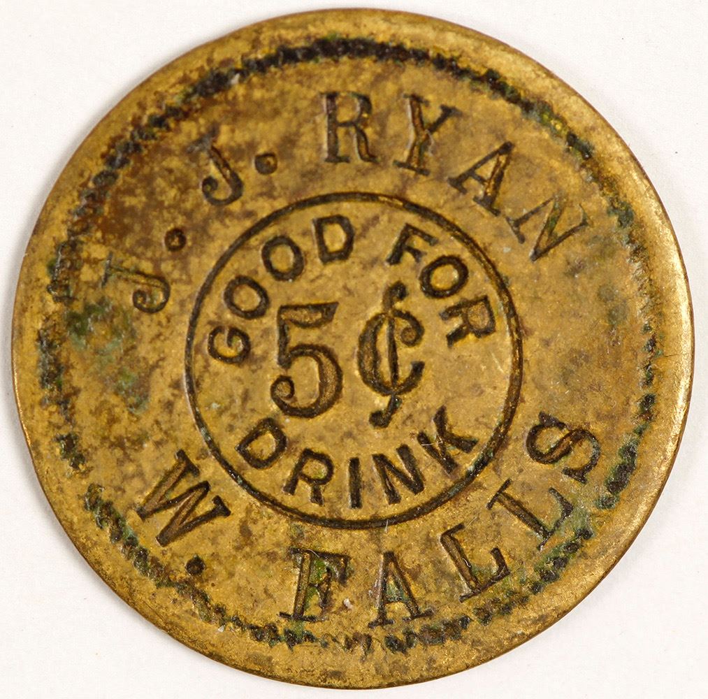 Round brass 24mm J. J. RYAN / GF 5C DRINK / W. FALLS // ILLEGIBLE AND WORN. Rare token. HWAC# 62367 Date: Location: Wichita Falls, Texas