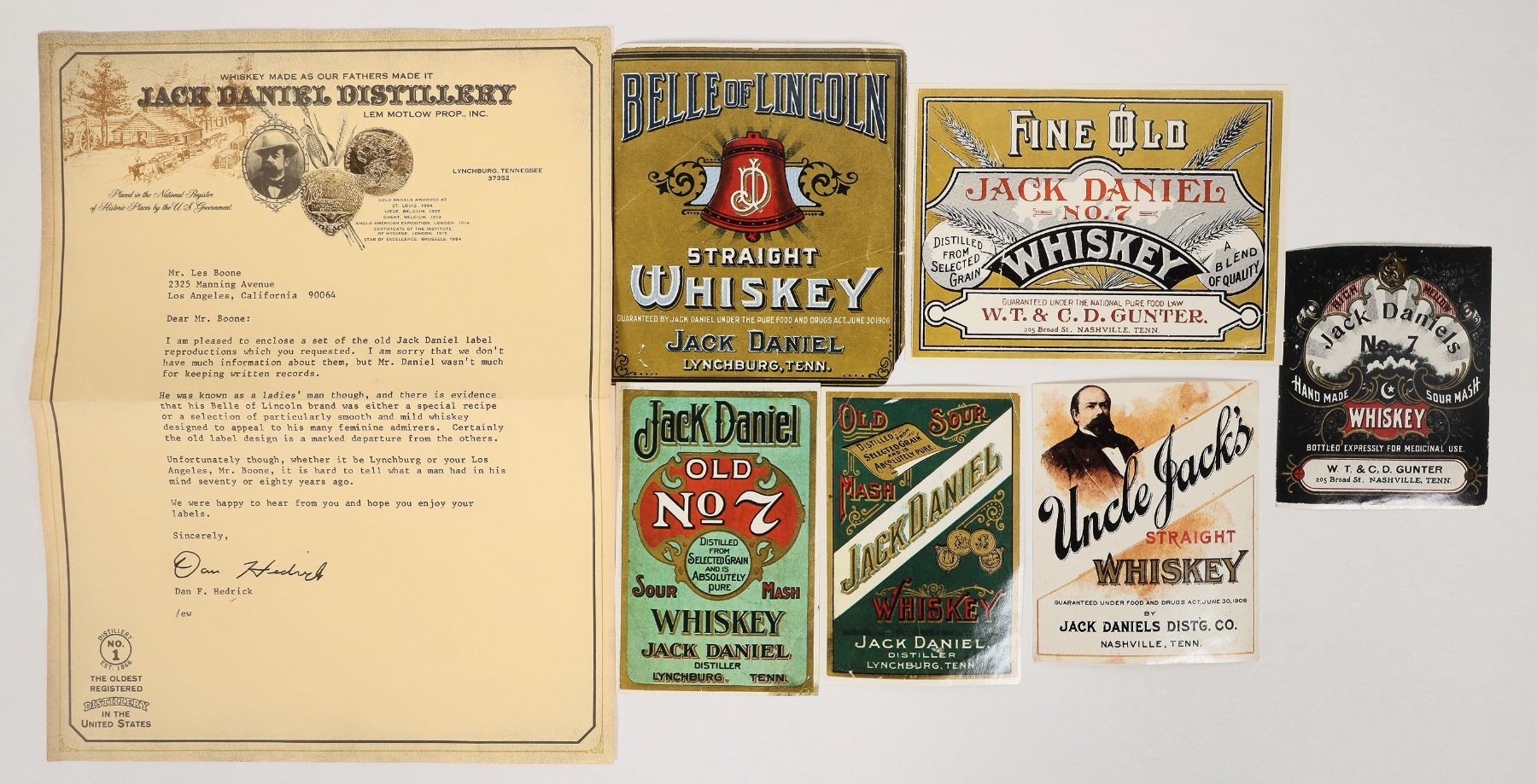Undated typewritten letter from Dan F. Hedrick, on Jack Daniel Distillery letterhead from Lynchburgh, Tennessee, to Mr. Les Boone of Los Angeles, with six old Jack Daniel label reproductions which he had requested. Mr. Hedrick notes that Jack Daniels was "a ladies man".