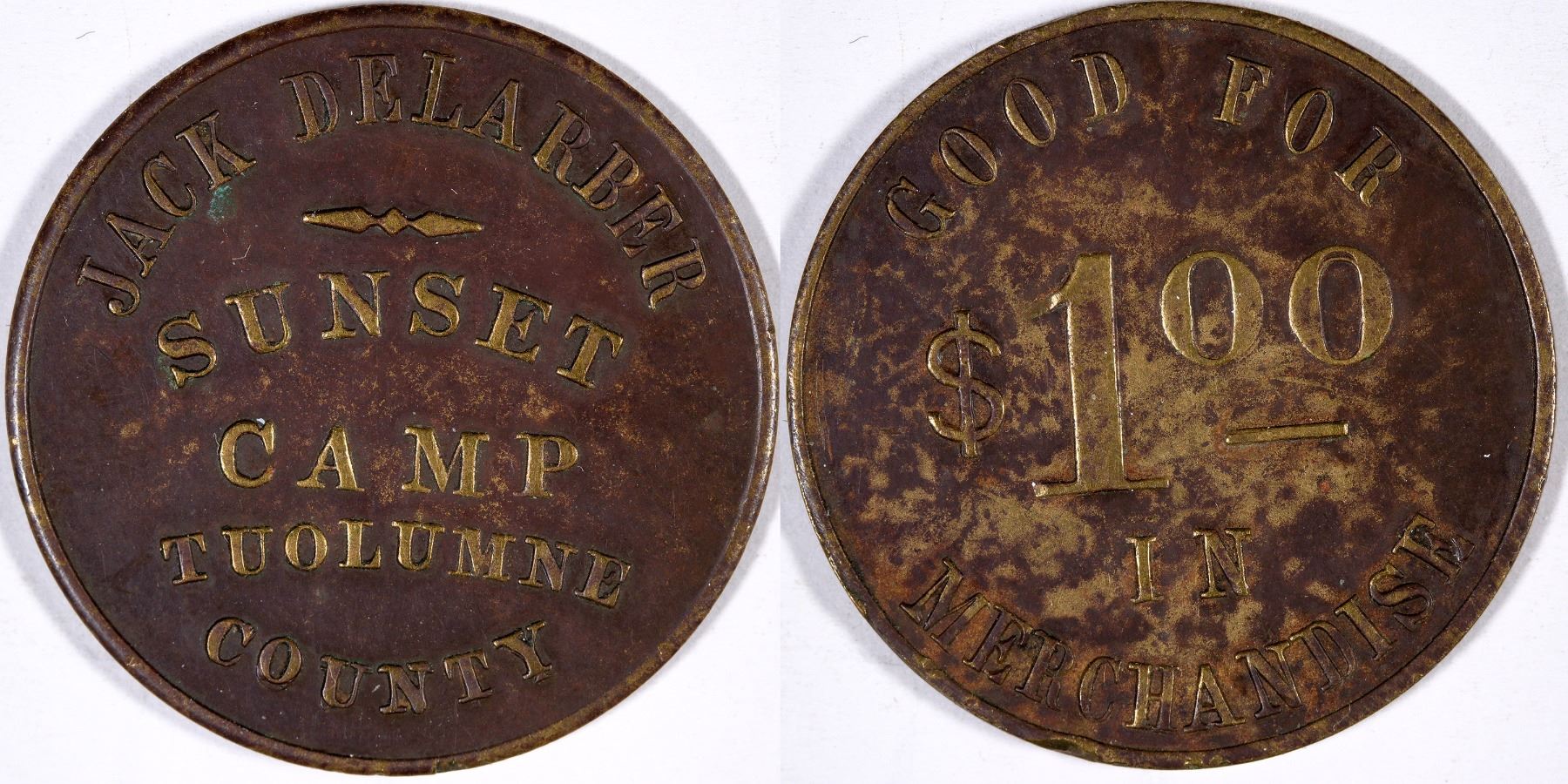 JACK DELARBER / SUNSET / CAMP / TUOLUMNE / COUNTY // GOOD FOR / $1.00 / IN / MERCHANDISE; Br., rd., 31 mm. Ex.: Ron Lerch collection.