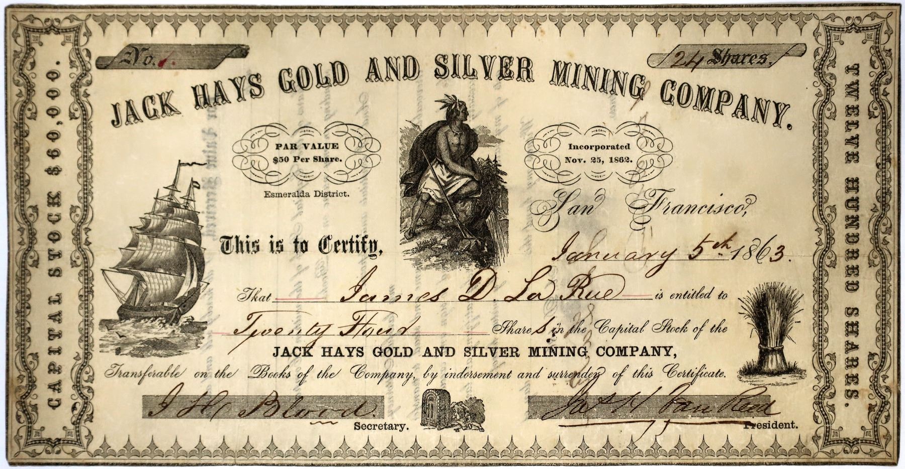 # 1 for 24 shares to James D. LaRue. Signed by JH Blood and James H Van Reed. Dateline San Francisco Jan 5, 1863. Incorporated Nov. 25, 1862. Not cancelled. Three vignettes: sailing ship, Native American and hay stack. Located in Esmeralda District. Miner edge issues (hard to see) and pin holes. Nice. The Jack Hays Mine was located on the Jack Hays and Newberger lodes. Colonel Jack Hays (namesake?) was a former Texas Ranger and lead the volunteer forces against the Indians in the second battle of Pyramid Lake. The original trustees were James H Van Reed, Thomas A Lane and Jesse B Sanders. [Daily Alta California, texasrangers.org]