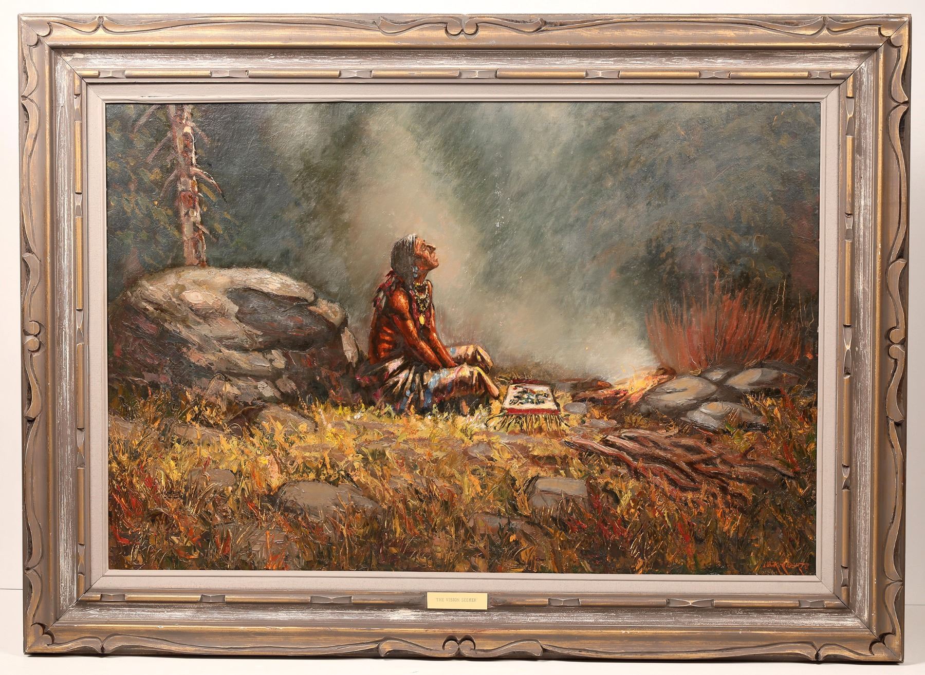 Original oil painting, 44" x 33" framed. Entitled the Vision Seeker by Jack Roberts signed at lower right. Jack Roberts, 1920-2000, was a famous Colorado based artist known for his beautifully captured Western scenes featuring cowboys, Indians, and frontier life.