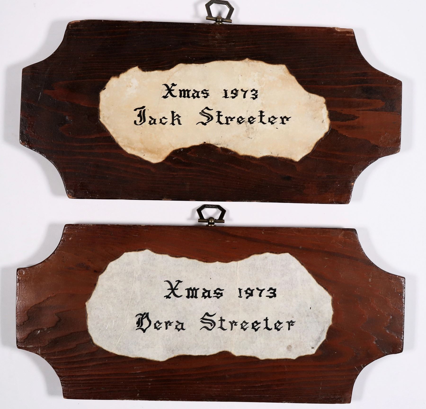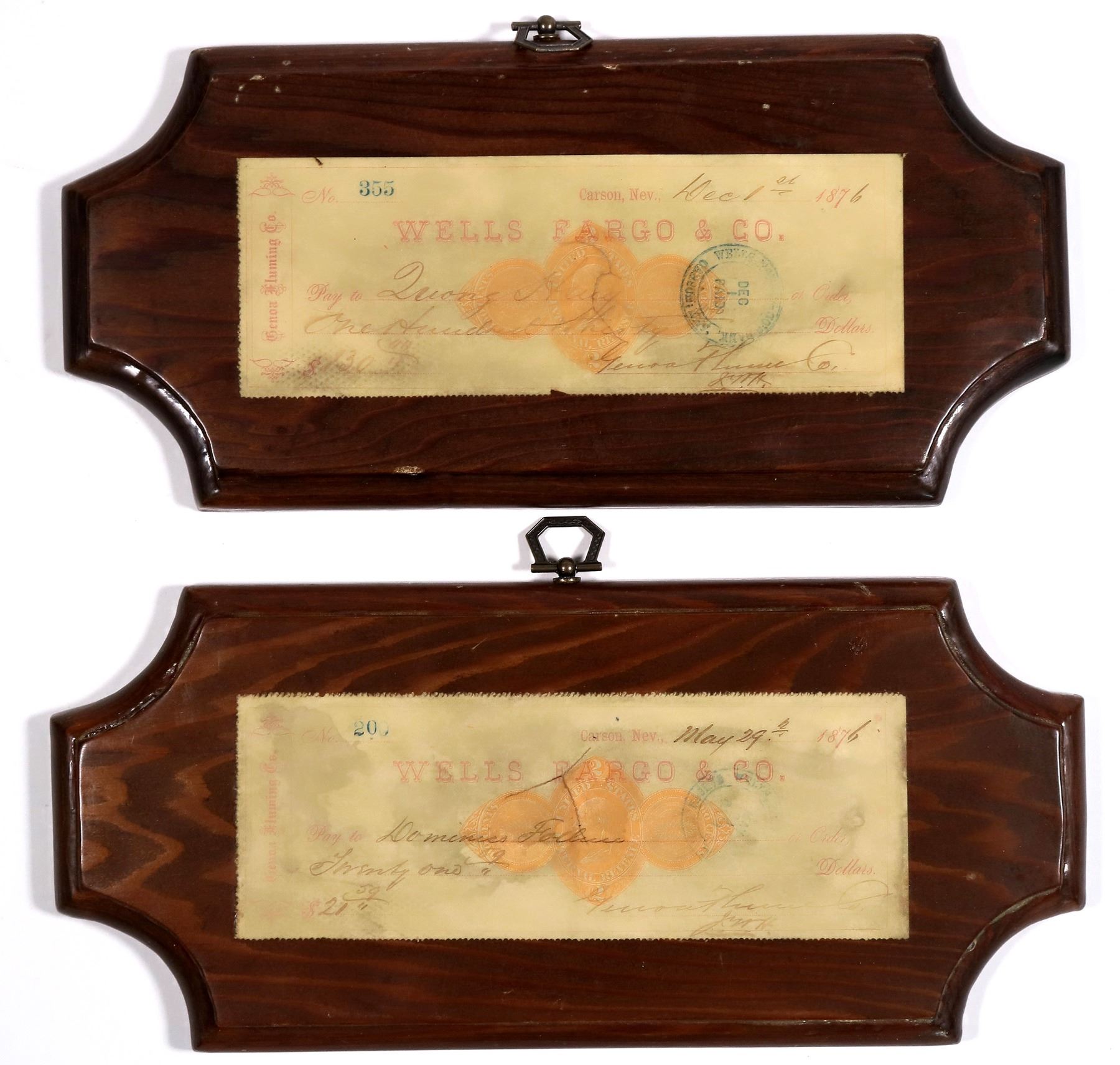 2 1973 Xmas gift plaques of Wells Fargo Genoa Fluming Co. checks on wood from Jack and Vera Streeter. Jack Streeter "was Nevada's most-decorated veteran. He won five Silver Stars, two Bronze Stars, five Purple Hearts, an Arrowhead Award for the assault landing on D-Day, a French and Belgium Croix de Guerres with palm, as well as the Combat Infantryman's Badge. Streeter left the Army in December 1945 with the rank of captain. He received his final Silver Star during halftime of a University of Nevada football game in 1946." from rgj.com. Plaque is 5.5x11.5" and is identified on back as a gift from Jack and Vera Streeter.