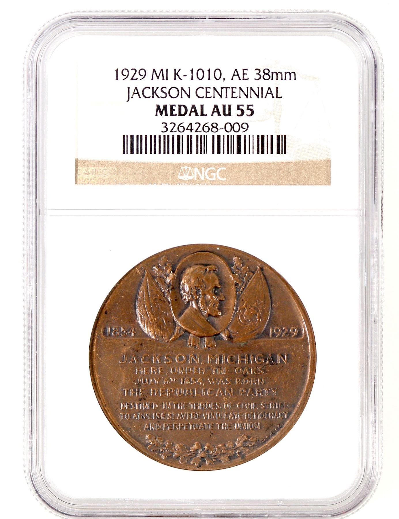 NGC graded AU 55. 1929, 38 mm. Where the Republican Party was born.