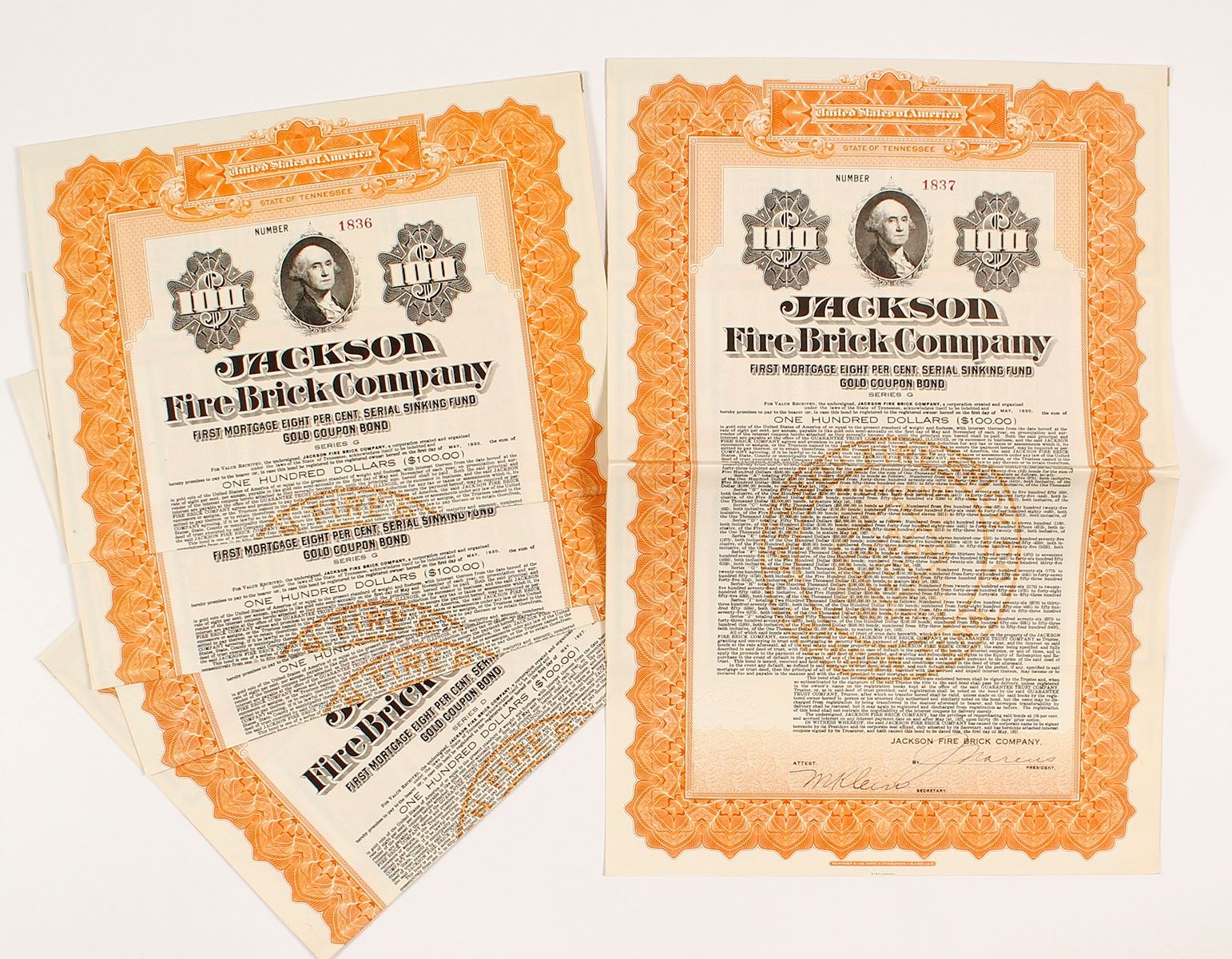Five Jackson Fire Brick Company $100 bonds issued in 1921. Orange border and George Washington vignette. 9.5 x 14." No. 888, 889, 1835, 1836, and 1837. All have some quantity of coupons still attached. None are cancelled. Inc. in 1917. Clay lands and brick plant at Gilmore, Tennessee. Office in Jackson. (Prag Collection) Date: 1921 Location: Gilmore, Tennessee HWAC# 54689