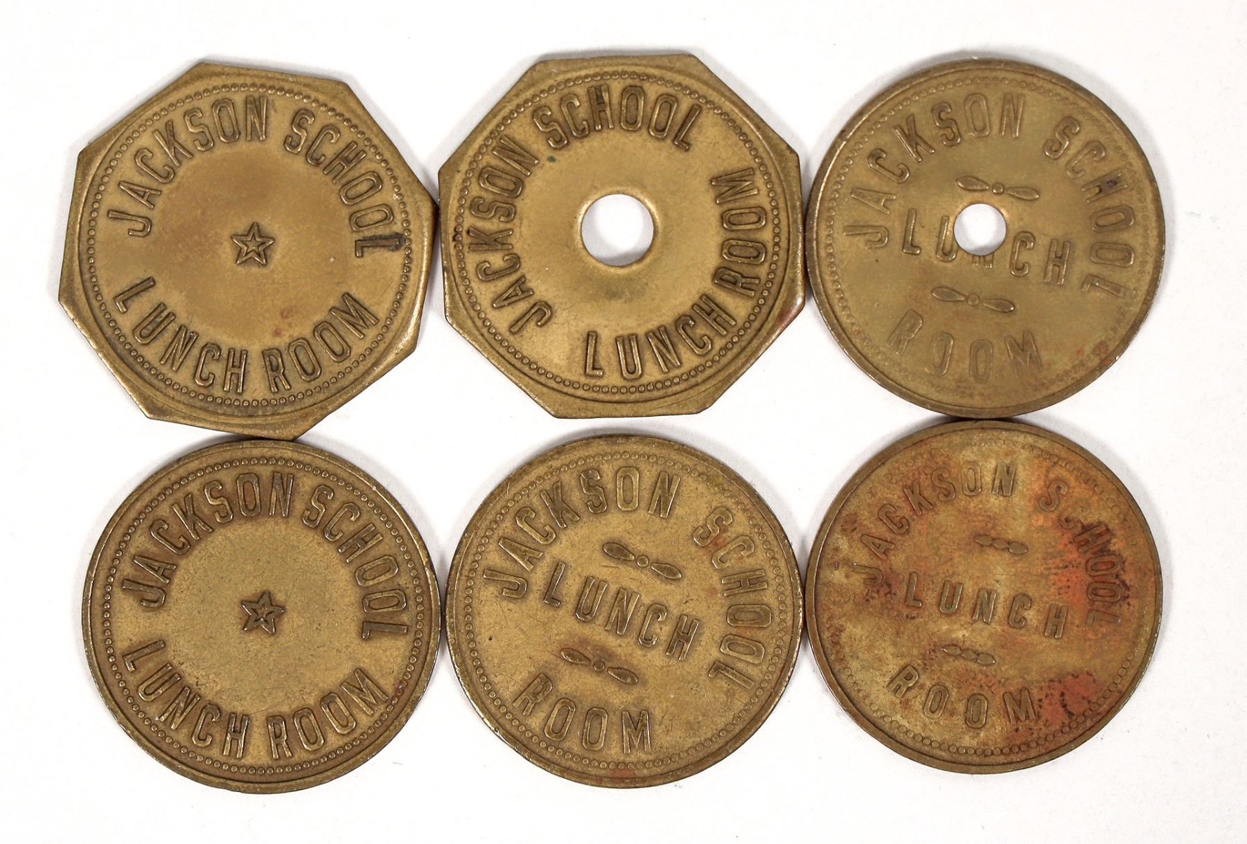 Group of six tokens: four round, two octagonal; two are holed. All say: Jackson School Lunch Room both sides. Brass and 28 mm.