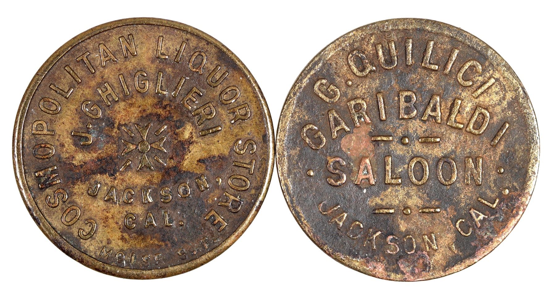 2 Jackson tokens. Cosmopolitan Liquor Store. Garibaldi Saloon. Jackson Colorado