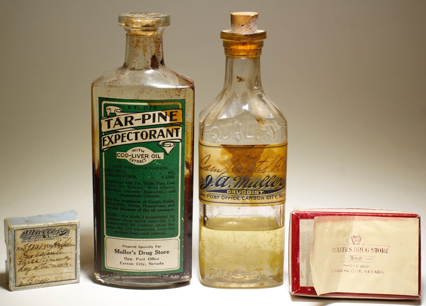 ( lot of 4) .Item #1 of 4 ) : ( Labeled only ) : Tar -Pine Expectorant/ with Cod -Liver Oil/ Extract , 6 1/4"x 2 1/4" in size, square collar top. ALSO, HAS SOME OF THE CONTENTS, COVERING 50% OF THE INSIDE OF THE BOTTLE. //. Item # 2 of 4 : ( embossed on label ). Camphorated Oil / J.A. Muller/ Druggist/ Opp. Post Office / Carson City, Nev. // Bottle embossed : " Quality " at the shoulder, and " Purity" at the front base. Triple square collar top, 5 7/8" x 2" in size. ALSO HAS 1/4 OF THE ORIGINAL CONTENTS. ! (Both bottles are ABM, machine made, after 1910+ ). Item #3 of 4: Pill box: From a DR.White to Mrs . Stanton, with Directions. Cotton filled no, medication left. From the Muller Drug Store , Carson City, Nevada. Perfect. Item #4 of 4 : Pill Box Lid only, embossed " Muller's / Drug Store..." Take one capsule , three times a day " / J. Brigs/ 4/4 /24. // ( RH). State: Nevada City: Carson City Date: 1910-1922 HWAC# 61424