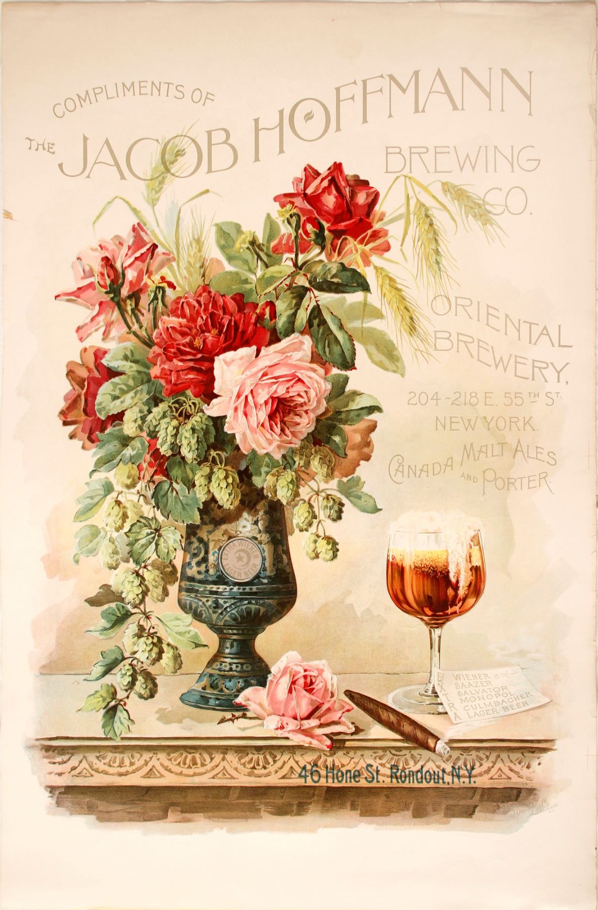 Colorful still life print. Compliments of Jacob Hoffman Brewing, Oriental Brewing, New York. Hoffmann emigrated from Germany in 1854, and bought up various breweries until Jacob Hoffmann Brewing Company was established in 1887. Print by J. Ottmann Litho Co. Approx 31 x 21". Note 1"left side tear.