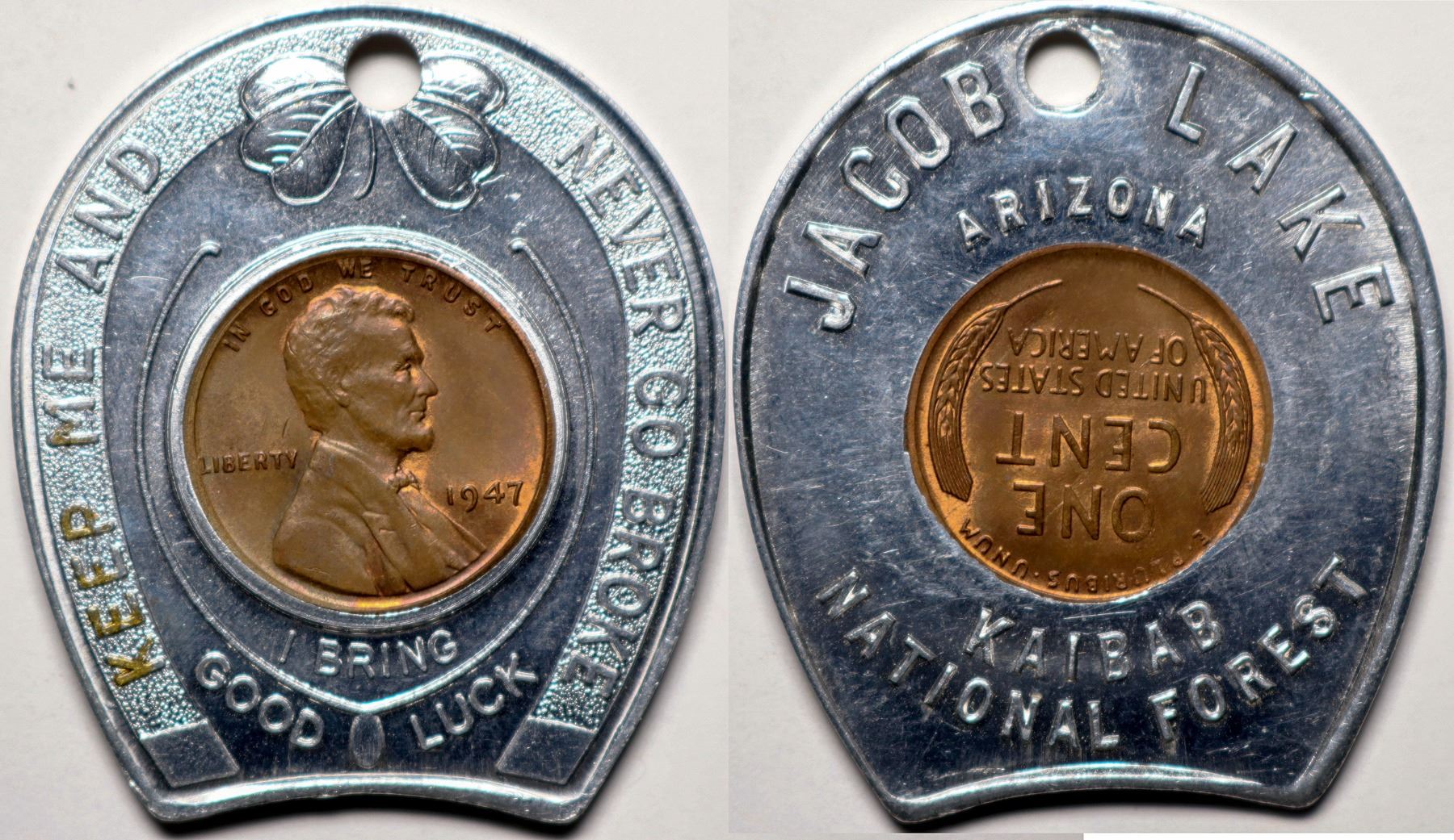 Jacob Lake/ Kaibab / National Forest// "Keep me and never go broke." Encased 1947 Abraham Lincoln Penny in aluminum horseshoe. Nail hole for hanging.