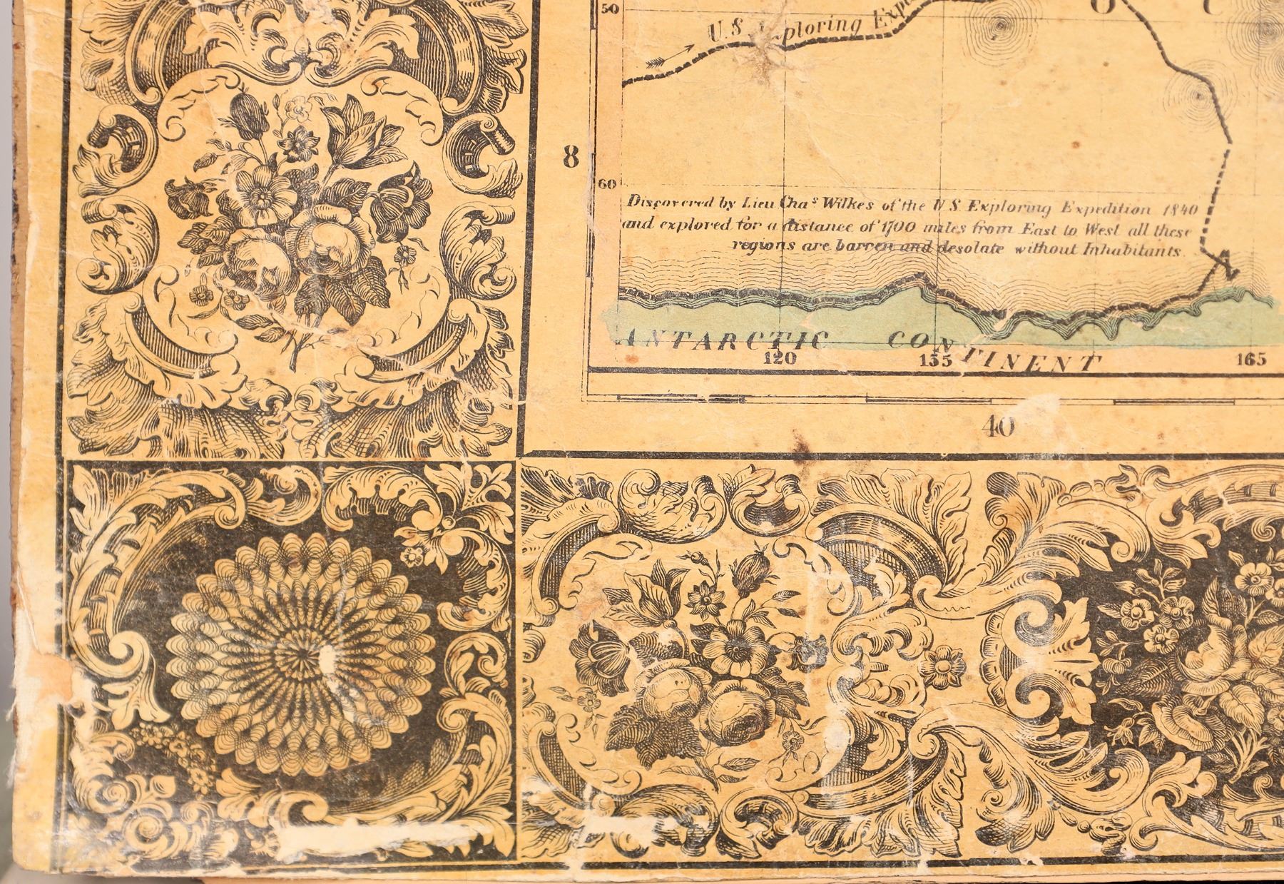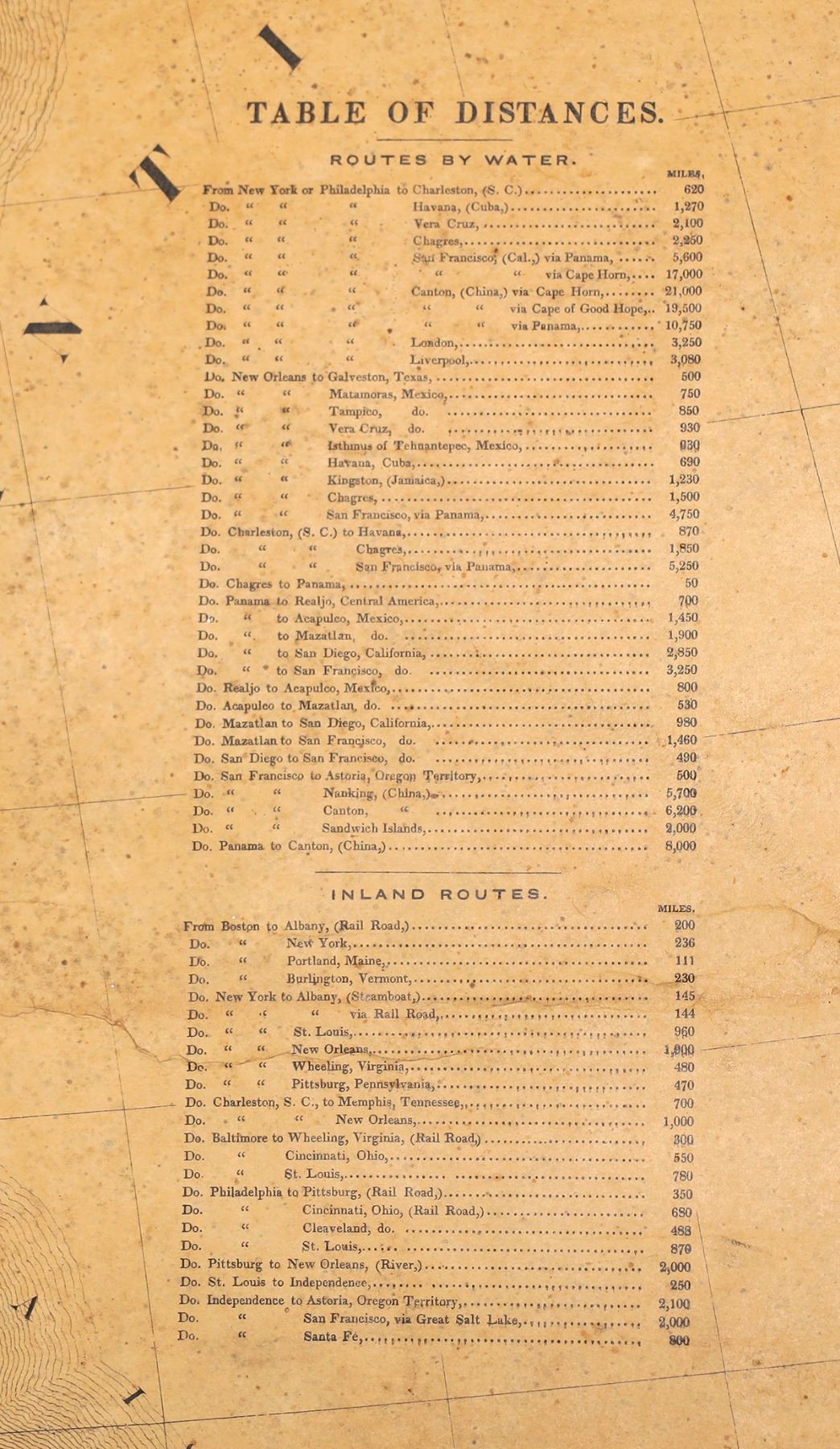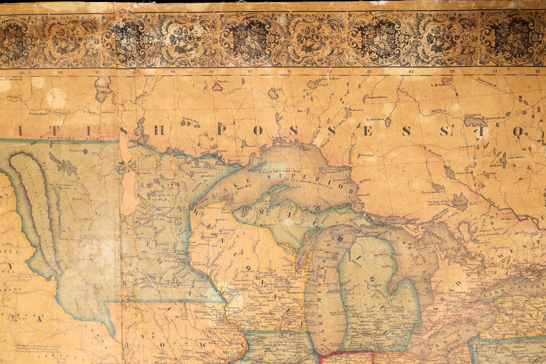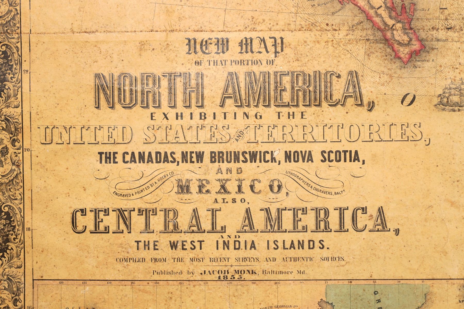 Large wall map, typical varnish finish, mounted to board for viewing. "New map of that portion of North America exhibiting the United States and Territories, the Canadas, New Brunswick, Nova Scotia, and Mexico also Central America and the West India Islands. Jacob Munk publisher, 1853, Baltimore, Maryland." Monk was an active American map maker in Baltimore the 1850s. I was unable to find information on Mr. Monk prior to 1850 (fh). He is not listed in the 1845 or 1849-1850 Baltimore directories. Monk published his first large wall map (his first map) sometime in January, 1851 to good acclaim. He advertised widely on the east coast. As Monk sent his map around for review, a number of corrections were suggested, such that a new, "corrected" version was published about January, 1853 after he had received approval from the US Bureau of topographical engineers. This edition of the map (1853) also included a Mercator's projection in the lower corner. Monk touted: "this is the only map with a complete and well developed map of Central America." He further noted that he had placed "over 100 important towns where court houses are located." and "exploring routes laid down with equal clearness." Another Jacob Monk in Philadelphia advertised for what appears to be salesmen throughout America both before, during, and after the other Monk's maps were published, thus is probably a different man. This map is rare. It shows all of the western territories clearly, the various routes taken by Kearney, and Fremont's 1843, 1844 and 1845 routes are noted as "F's 1844". Certain weaknesses exist in the western portion as might be expected for the time. Lake Bigler, in example (Tahoe) is not shown. Walker Lake shows as "Waller's". Several key forts are present, including Fort Hall, Fort Bridger, Mormon Fort. Figural clipper ships abound in the oceans, and the 2" wide border contains alternating floral patterns inside shield like vignettes. The map is 59 across x 56" tall and is adhered to a board. Otherwise very good.