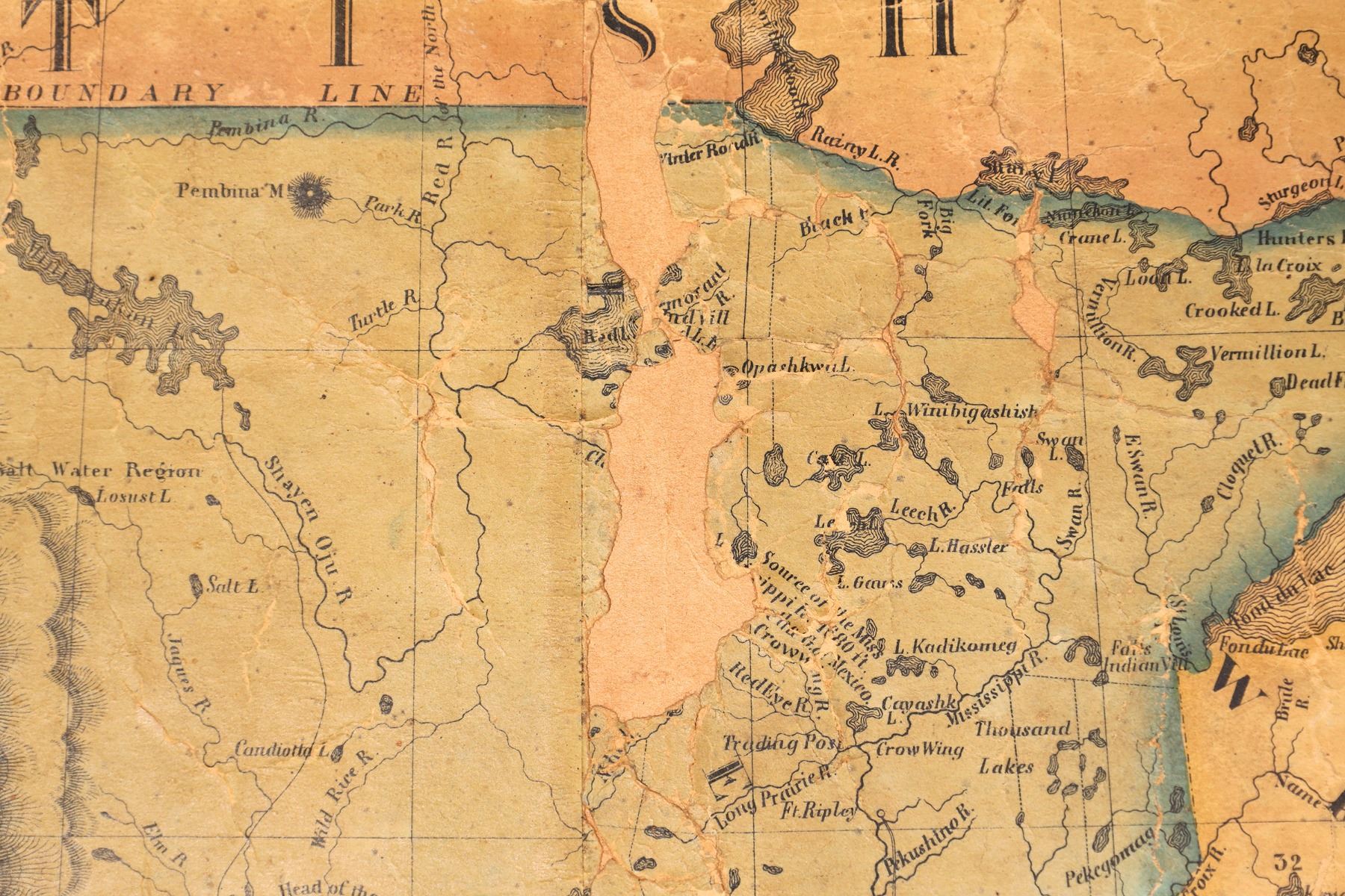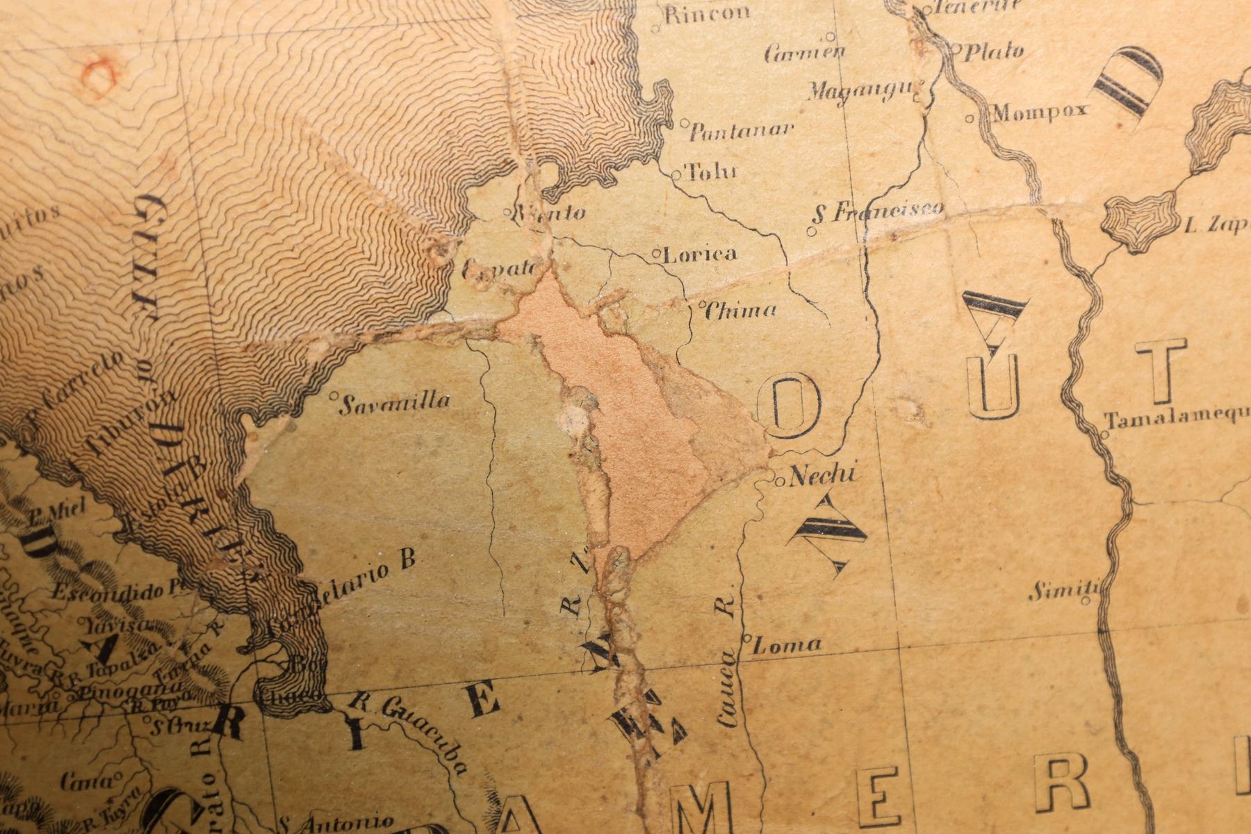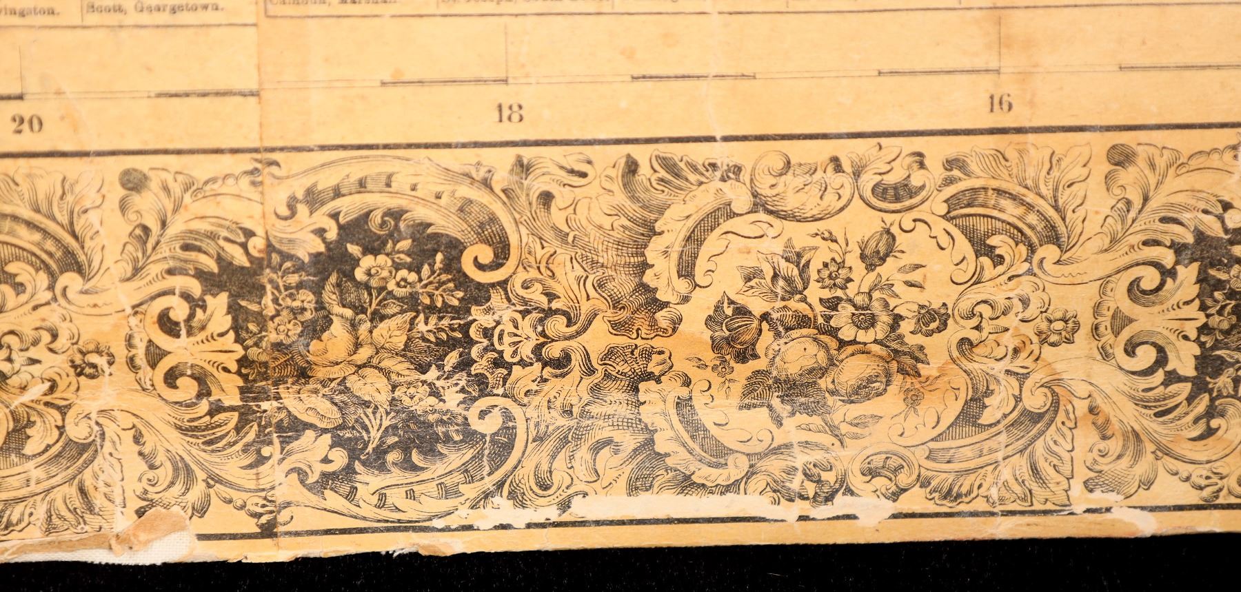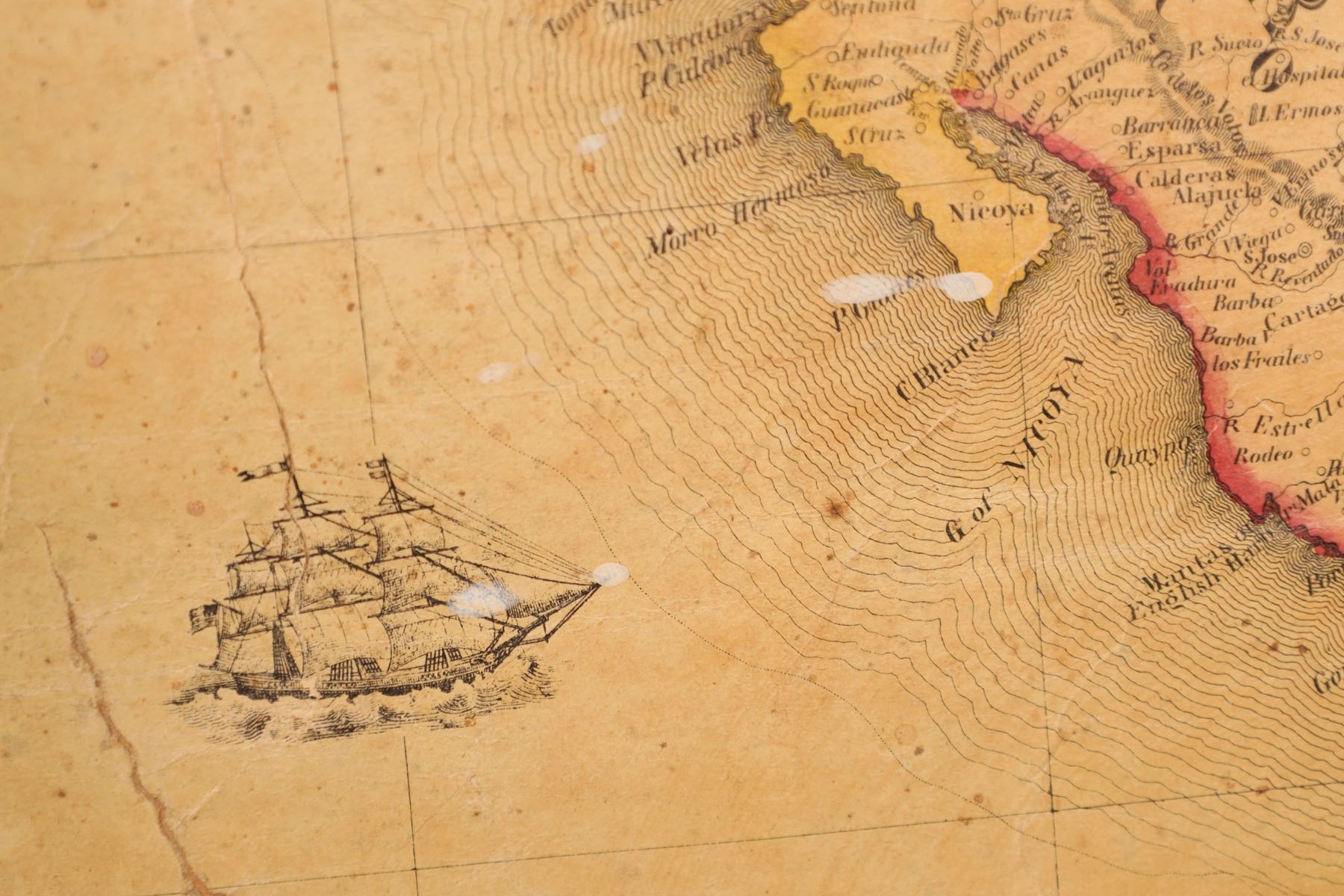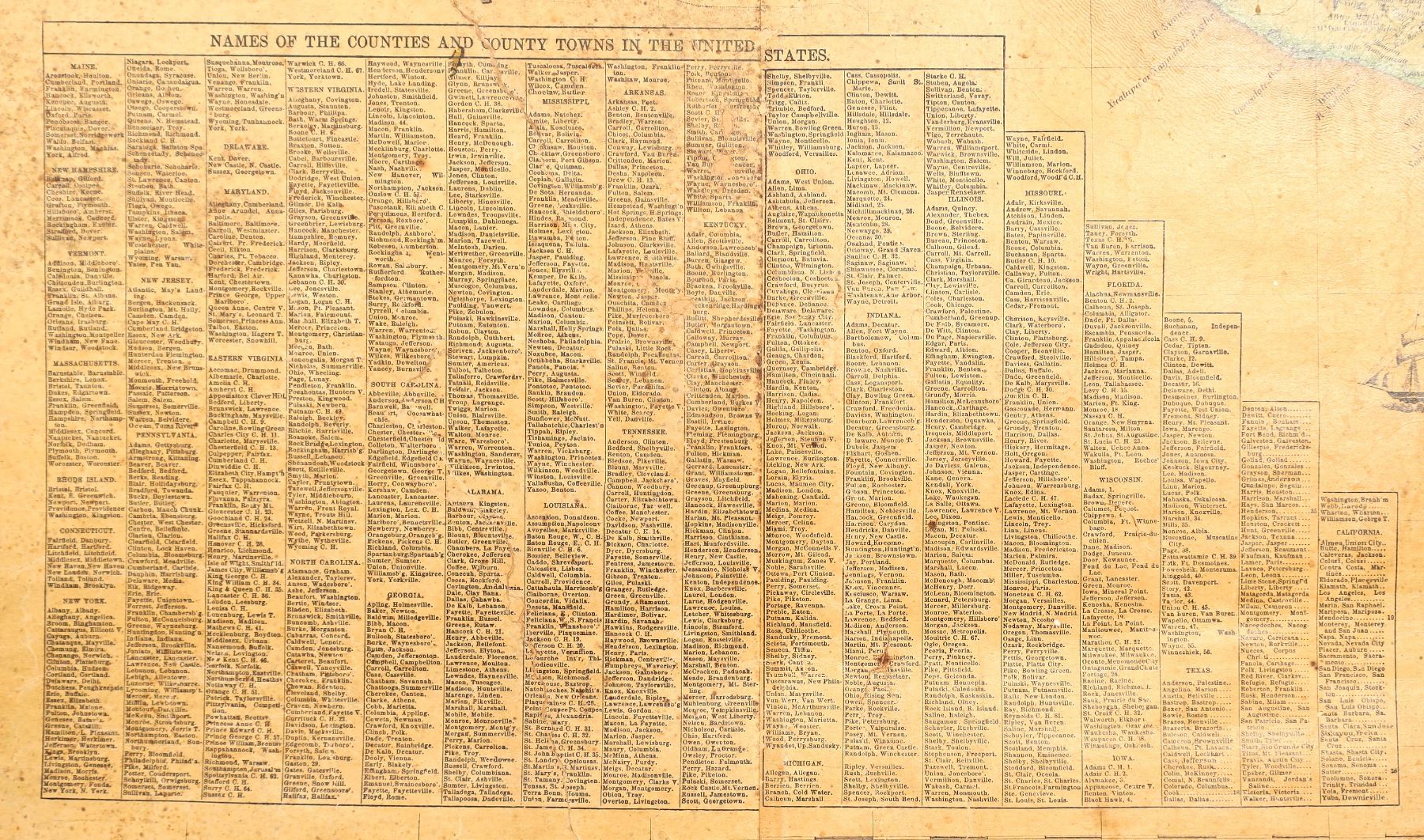 Large wall map, typical varnish finish, mounted to board for viewing. "New map of that portion of North America exhibiting the United States and Territories, the Canadas, New Brunswick, Nova Scotia, and Mexico also Central America and the West India Islands. Jacob Munk publisher, 1853, Baltimore, Maryland." Monk was an active American map maker in Baltimore the 1850s. I was unable to find information on Mr. Monk prior to 1850 (fh). He is not listed in the 1845 or 1849-1850 Baltimore directories. Monk published his first large wall map (his first map) sometime in January, 1851 to good acclaim. He advertised widely on the east coast. As Monk sent his map around for review, a number of corrections were suggested, such that a new, "corrected" version was published about January, 1853 after he had received approval from the US Bureau of topographical engineers. This edition of the map (1853) also included a Mercator's projection in the lower corner. Monk touted: "this is the only map with a complete and well developed map of Central America." He further noted that he had placed "over 100 important towns where court houses are located." and "exploring routes laid down with equal clearness." Another Jacob Monk in Philadelphia advertised for what appears to be salesmen throughout America both before, during, and after the other Monk's maps were published, thus is probably a different man. This map is rare. It shows all of the western territories clearly, the various routes taken by Kearney, and Fremont's 1843, 1844 and 1845 routes are noted as "F's 1844". Certain weaknesses exist in the western portion as might be expected for the time. Lake Bigler, in example (Tahoe) is not shown. Walker Lake shows as "Waller's". Several key forts are present, including Fort Hall, Fort Bridger, Mormon Fort. Figural clipper ships abound in the oceans, and the 2" wide border contains alternating floral patterns inside shield like vignettes. The map is 59 across x 56" tall and is adhered to a board. Otherwise very good.