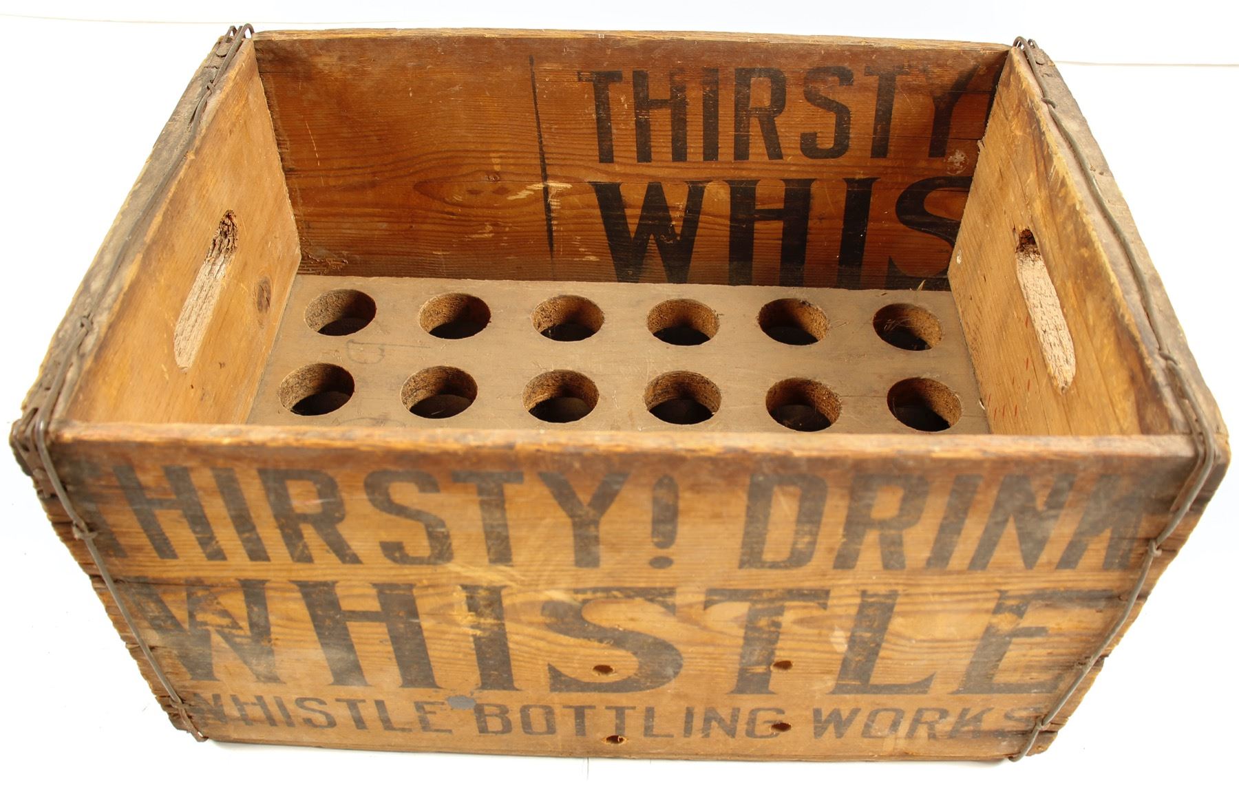 Original soda or beer wood box from Jacob Richter Beverages Fresno, marked on the end boards. The two sideboards contained much older style lettering, Thirsty Drake Whistle, Whistle Bottling Works. Looking at the inside of this box, the whistle panels are older,and the box was converted to a Richter box. Contains the rounded out holes for 24 bottles turned upside down. Rare. (Daniel Manassellian Collection)