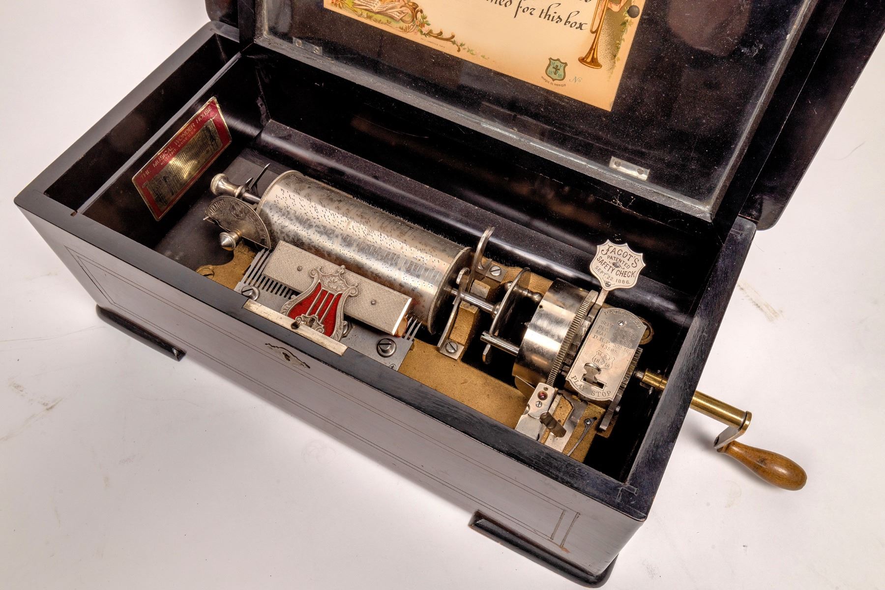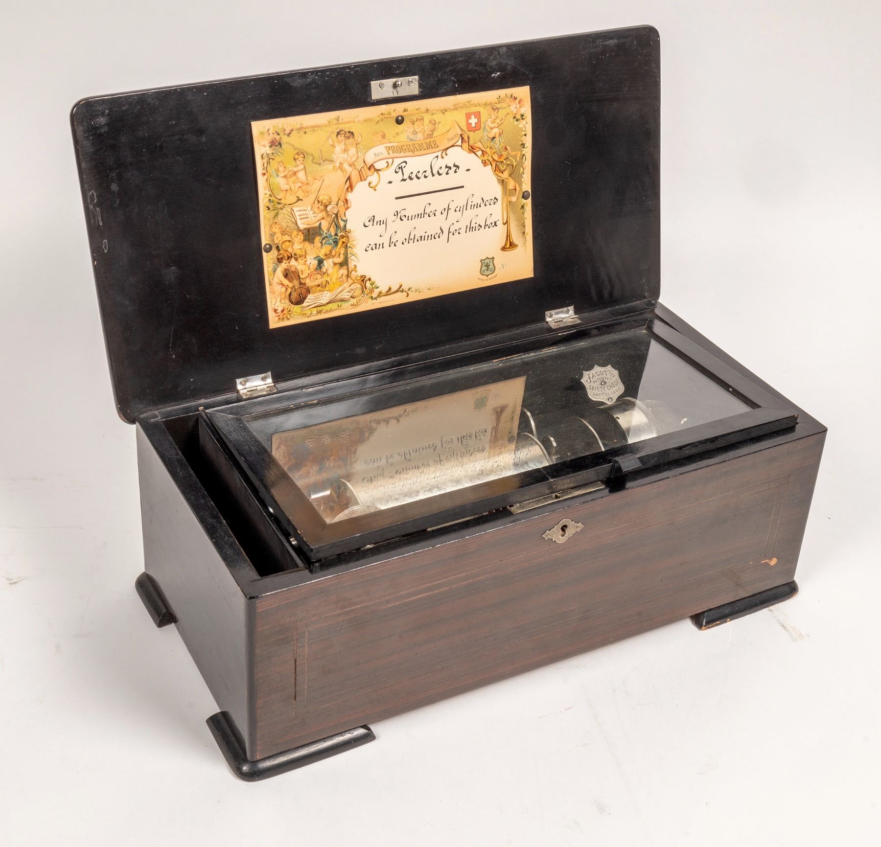 Jacot Peerless 19th century mechanical music box, not working, but complete with crank for winding. Removable pin cylinder appears to have six different tunes that will play sequentially as the spring motor drives it. Crank has resistance when attempting to wind it gently, so the main spring is probably intact and the speed regulation mechanism just needs to be carefully cleaned. Inside cover has a handwritten sign (see photos) noting that other pin cylinders are available. Beautiful inlaid wood in floral pattern on the cover, and the box is overall in very good condition for being more than a century old. Some knowledgeable cleaning or repair work inside could get this running and playing again.