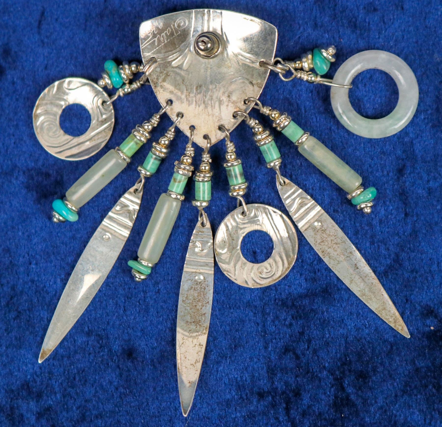 Asian jade pendant in gold toned setting. Jade pierce raindrop earrings set in silver. Also included: interesting earrings, possibly chrysocolla or variscite pale green oval stones set in silver triangular form and hung with various charms. 3" long, pierced.