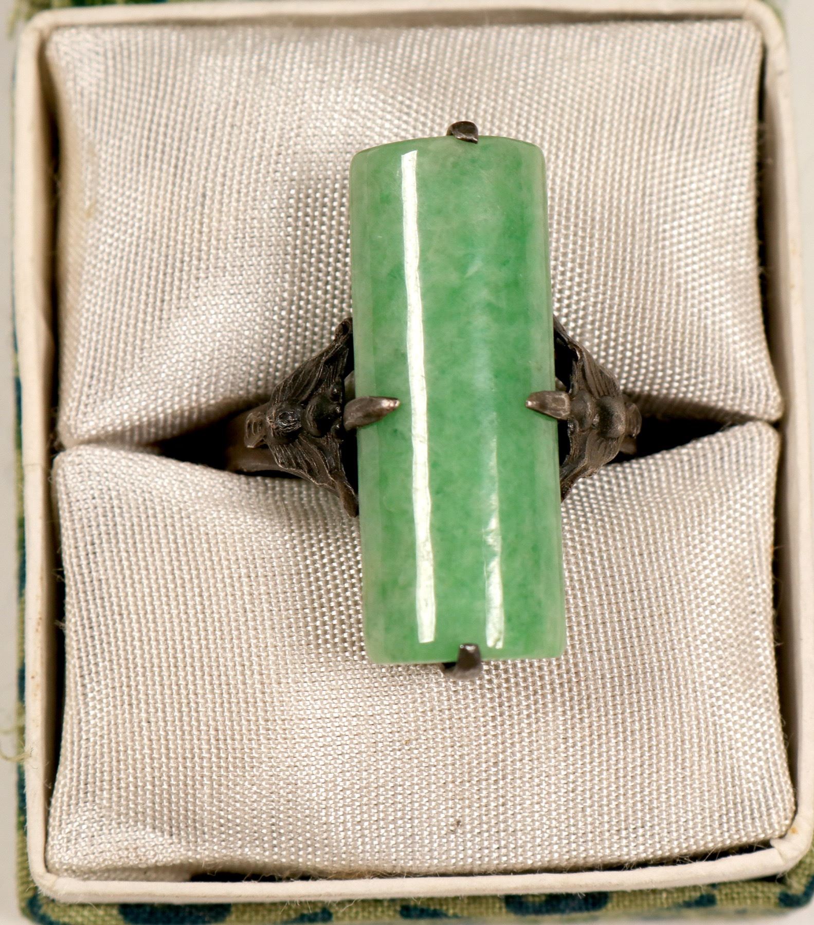 Here is a beautiful, and very unusual ring .It is Chinese and has an elongated concave mounting, held on by butterfly clamps on two sides. Also, it is mounted in silver with Chinese characters embossed inside. And, is made adjustable !! Pretty nice quality jade as well. Plus, it comes with a nice presentation box. Have someone special, give her this ring, and make her heart sing !! Perfect condition.(RH).