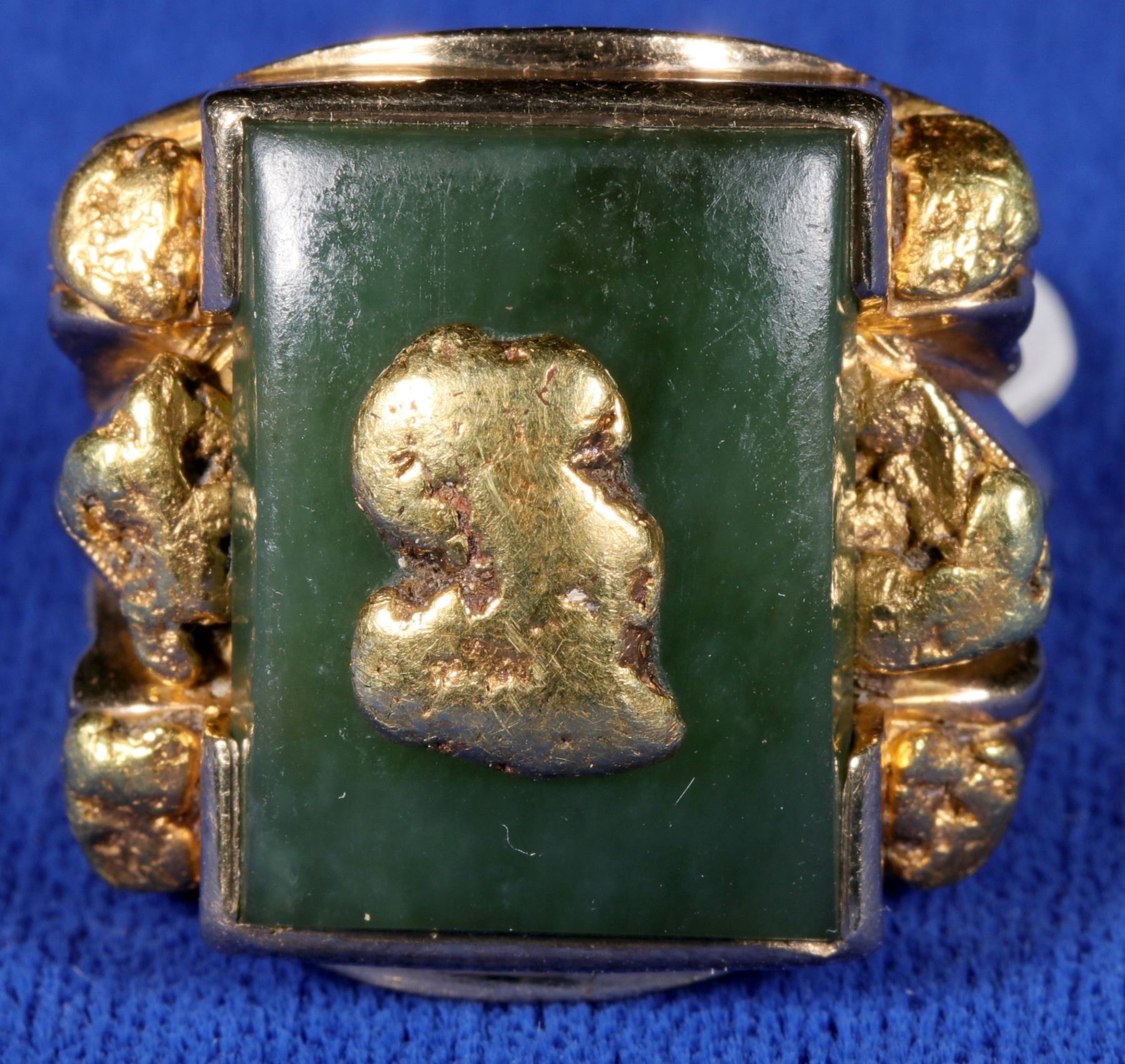 Heavy, unusual, 10K man’s gold ring set with 6 raised gold nuggets and 1 center raised nugget set in in dark green jade. 15.8g. Very good condition, size 7.75.