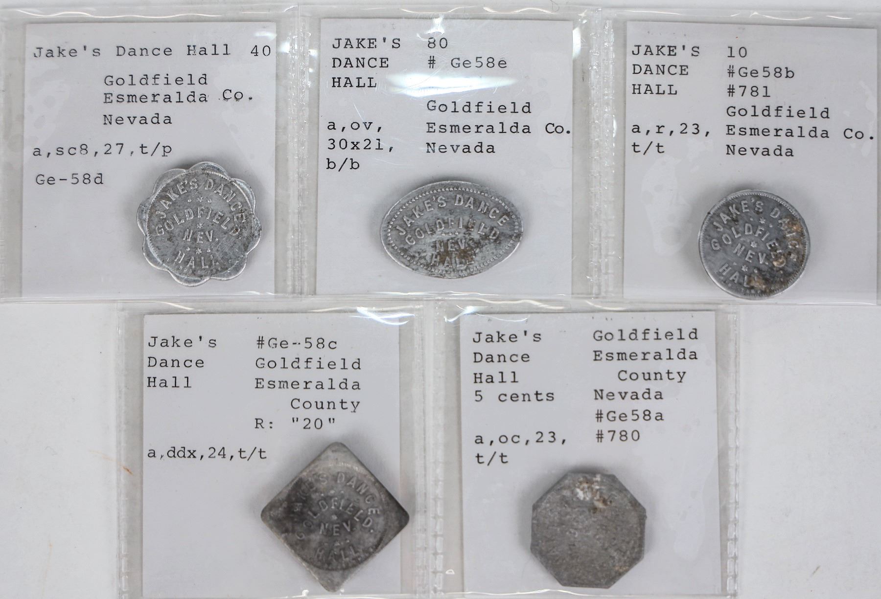 The entire five token family from Jake's Dance Hall of Goldfield: Good for: 5 cents (octagonal); 10 cents (round); 20 (square); 40 (8 sided scallop); 80 (oval, 30 x 21). Made by LA Rubber Stamp Company, all aluminum. A rare opportunity to get them all in one lot.