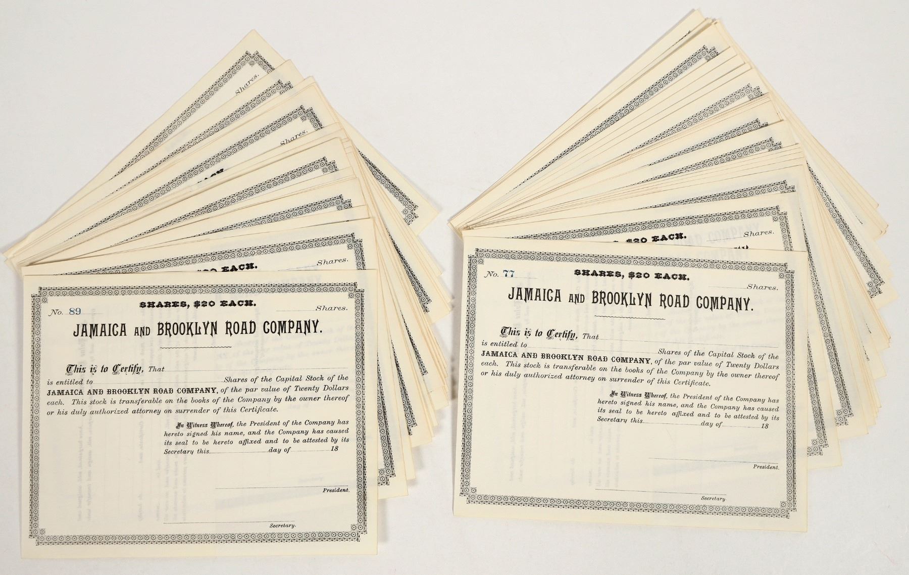 Group of approx. 40 unissued stock certificates for $20 shares in the Jamaica and Brooklyn Road Company of New York City, all dated 18XX. All uncancelled. 9"x7" certs, all in excellent condition; see photos.