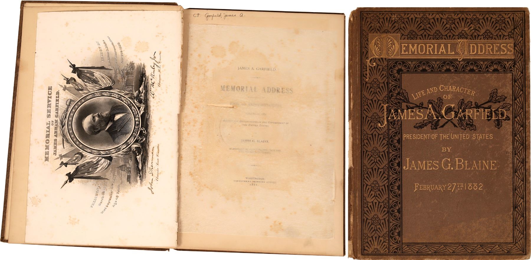 This first edition of the Life and Character of James A. Garfield by James G. Blaine is autographed by the author. It was published February 27, 1882, and it has 87 pages. Blaine served as Speaker of the House and as senator from the state of Maine. The book is in decent shape but shows some wear on the spine and staining on some of the back pages.