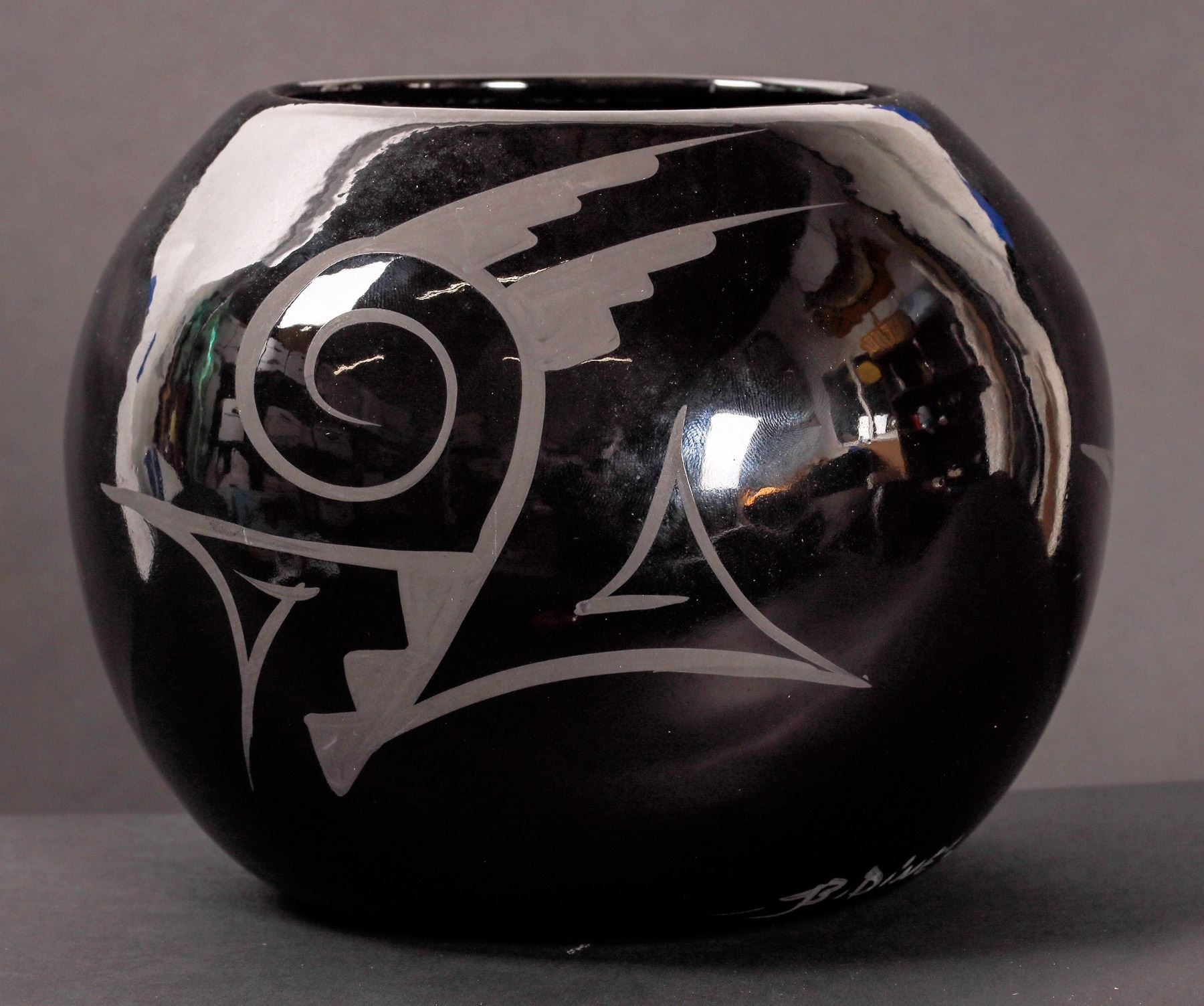 Black on Black Cedar Mesa bowl by Navajo artist James Benally signed B. Dine'. This is a more traditional style than most Benally work. 5" x 6"