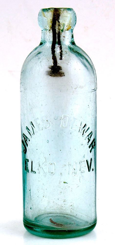 James Dewer / Elko, Nev. Aqua tool aqua applied top full face embossing. Dewer's soda business began in 1892. The business was known as the Elko Bottling Works. His sarsaparilla and syrups were a regular in local advertising. Inside stain never professionally cleaned. Anealing check in neck. Tiny epoxy repair in lip. Date: c1892-1895 Location: Elko, Nevada HWAC# 46074